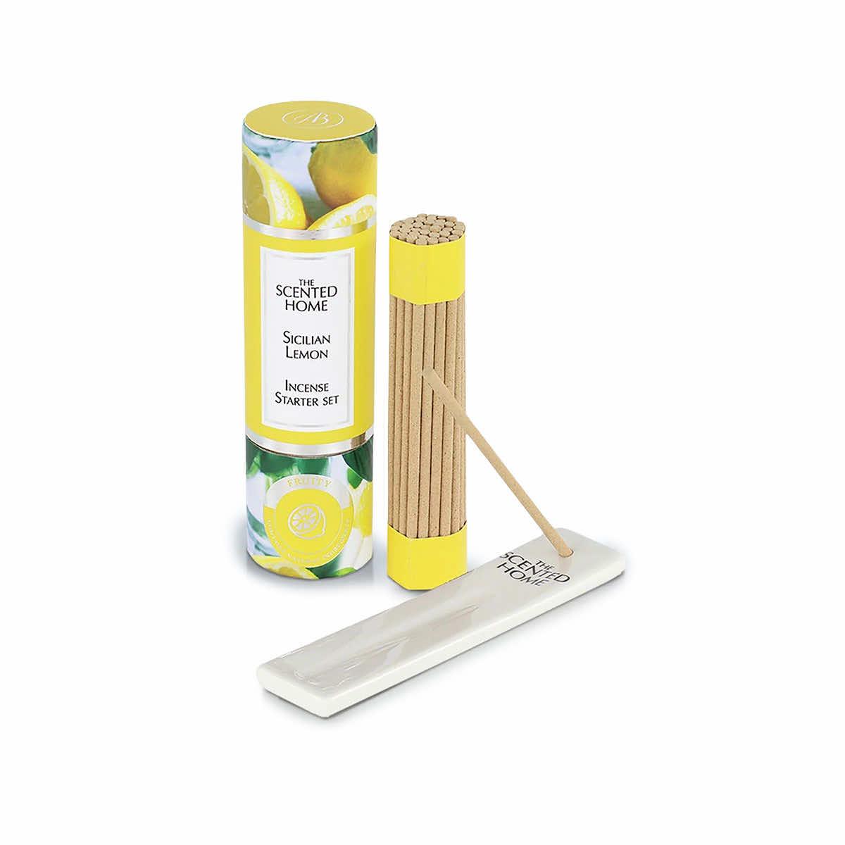 The Sicilian Lemon Mini Incense Set from Ashleigh & Burwood features juicy lemons, limes, and oranges tempered with the aromatic addition of green geranium. A stimulating and tangy fragrance, full of refreshingly zesty energy. This mini set contains everything needed to enjoy a smoky atmospheric scent in the home, including incense sticks and a ceramic holder.