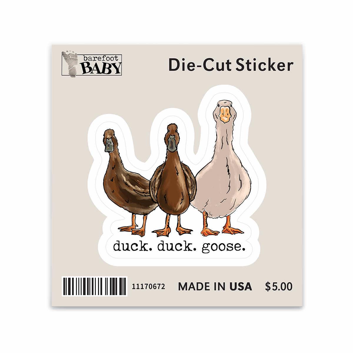 Circle up and get your ducks in a row for an iconic game with the fun Duck Duck Goose Sticker from Barefoot Baby! This durable vinyl sticker will add personality to your laptop, car, water bottle, or anywhere that needs a pop of color. It features a couple of ducks and a goose in line and waiting for a turn. Stick with it to show off your love for good times hanging out and playing a game of duck duck goose with this charming sticker!