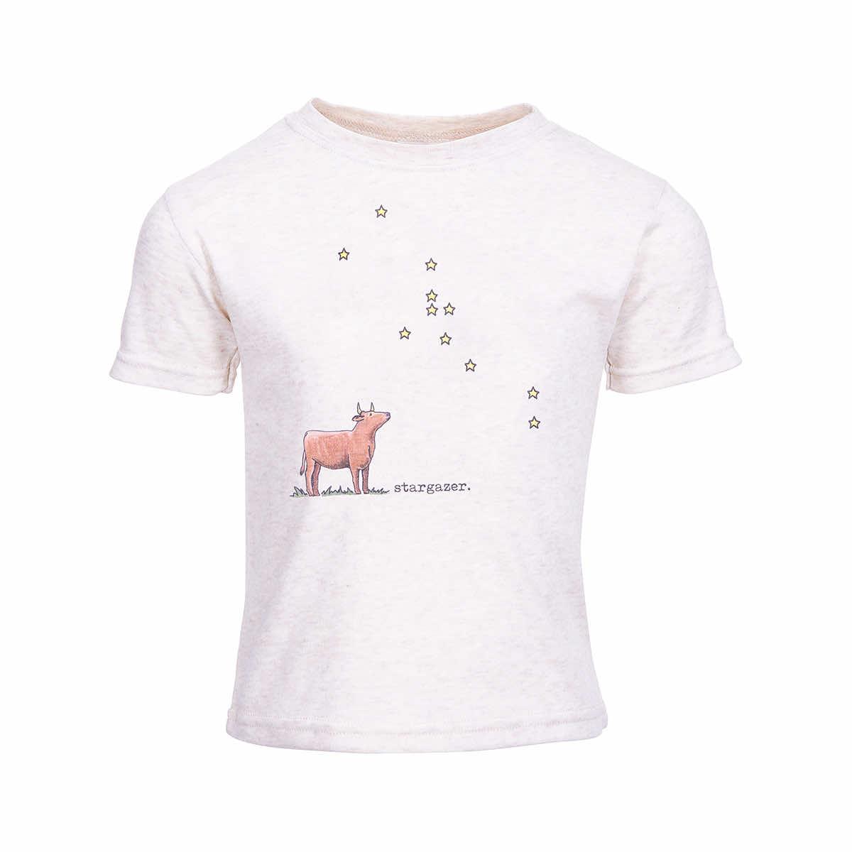 Share your little one's fun personality with the Toddler Stargazer Cow Short Sleeve T-Shirt from Barefoot Baby! What could be more adorable than a cow admiring his own constellation? Let your little one's mind be opened by the wonder of nature, from the animal kingdom to the solar system it's all out there to capture the attention of little wide eyes. By pairing farm animals and space the artists create a fun shirt that is super soft and machine washable!