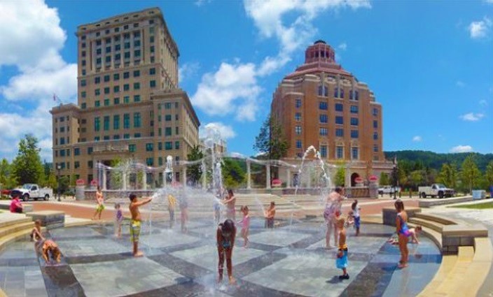 Over 10 years ago, the City of Asheville made the forward-thinking decision of creating a new outdoor gathering place in the heart of downtown. What was once a parking lot is now an expansive terraced 6.5-acre grassy knoll with a permanent pavilion that hosts a full schedule of outdoor concerts and festivals throughout the year. Located at 121 College Street, directly in front of City Hall and the County Building, Pack Square Park is the perfect place to lounge with your lunch under Carolina blue skies. You’ll find giggling adults and children enjoying Splashville, an interactive water fountain, directly in front of the Pack Square Pavilion. Splashville is open from 9 a.m. until 9 p.m. 7 days a week during the warmer months.