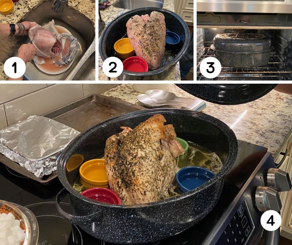 Fill 3 to 4 ramekins with water and place them around the turkey to “prop it up.” Then add about ½ to ¾ inch water in the bottom of the roasting pan. Cover and place in the oven. Follow the directions for the weight of your turkey breast. Carve and enjoy!