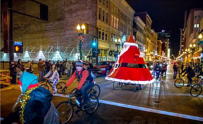 Knoxville’s parade on December 1 at 7 p.m. is filled with tiny points of light as it heads down the city’s main artery, Gay Street. But you don’t need to wait until December to get in the Christmas spirit. Knoxville’s Christmas in the City is a more than a month-long celebration of the season. Kick off the celebration with the Regal Celebration of Lights on Market Square/Krutch Park/Market Street. It’s the lighting of the Downtown Christmas Tree and includes hands-on activities for kids, the WDVX Ho Ho Ho Down, and more. Decorate your bike for a fun night-time ride through Knoxville with hundreds of your friends. The Tour de Lights is in its eleventh year and is a great family-friendly activity. Mast Store will have some hot cocoa waiting for you at the end.