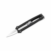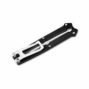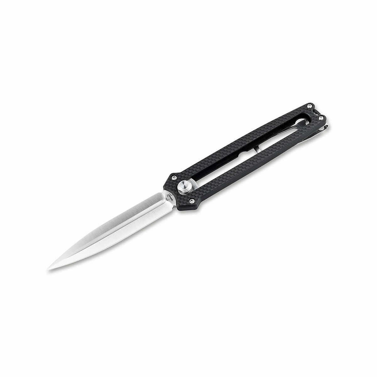 The innovative Slike Knife from Böker is a lightweight dagger supplied with a D2 blade ground on both sides that slides out of the front handle. Comparable to the mechanism of the widely used utility knives, the lock is released at the touch of the button and the satin-finished blade is then moved up or down manually. A detent at the halfway point further enhances work safety. It is supplied with a modern flat grind and a pronounced groove. The CNC-machined handle scales made of black G10 lie comfortably in the hand despite the pocket knife's small size. With a lanyard hole, large-sized deep-carry clip (tip-down), and high-quality nylon case for storage, the Slike Knife is a uniquely designed knife that is great for carry.