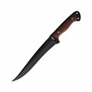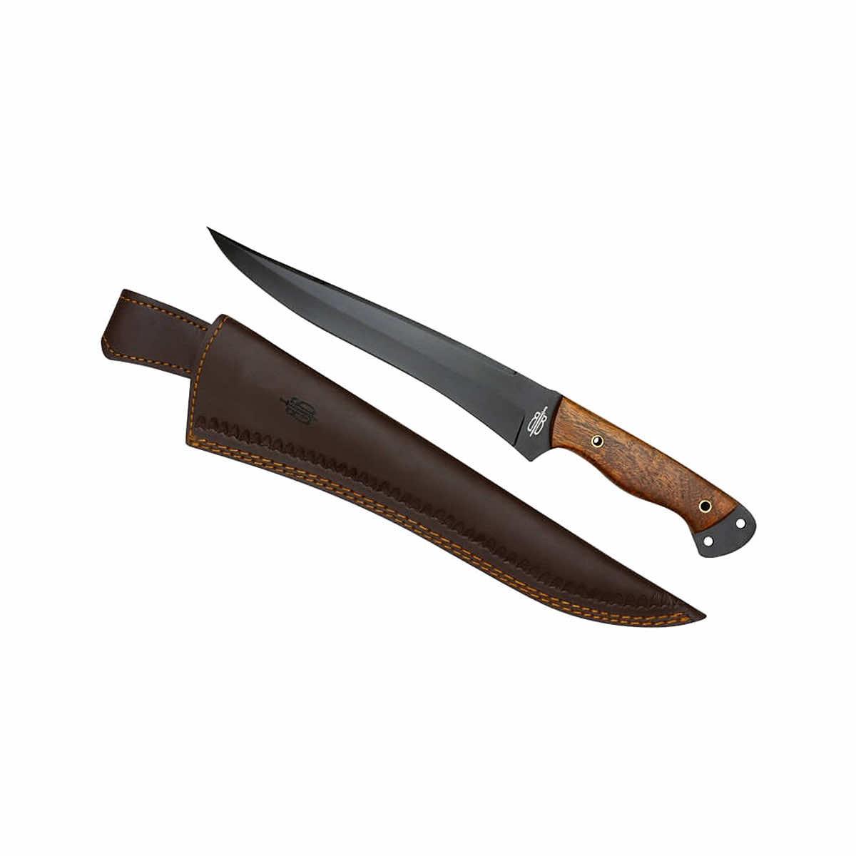The breathtaking Fisherman Filet Knife from BnB Knives is made of 1095 high-carbon steel with a powder-coated finish. This sharp knife has full-tang construction and an integrated guard. The handle is a walnut burl with hollow brass pins and a glass breaker with lanyard holes. This knife comes with a leather sheath with a belt loop to keep it safe and secure on your belt or fishing pack. Get clean cuts and precise filets with every catch when you use the Fisherman Filet Knife.