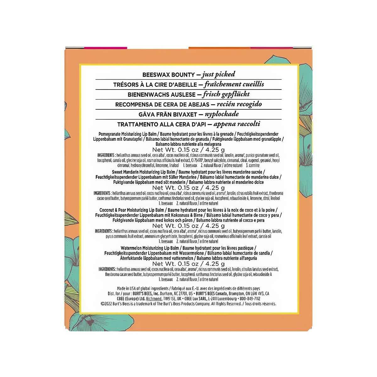 - Includes: Pomegranate Moisturizing Lip Balm, Sweet Mandarin Moisturizing Lip Balm, Watermelon Moisturizing Lip Balm, and Coconut & Pear Moisturizing Lip Balm