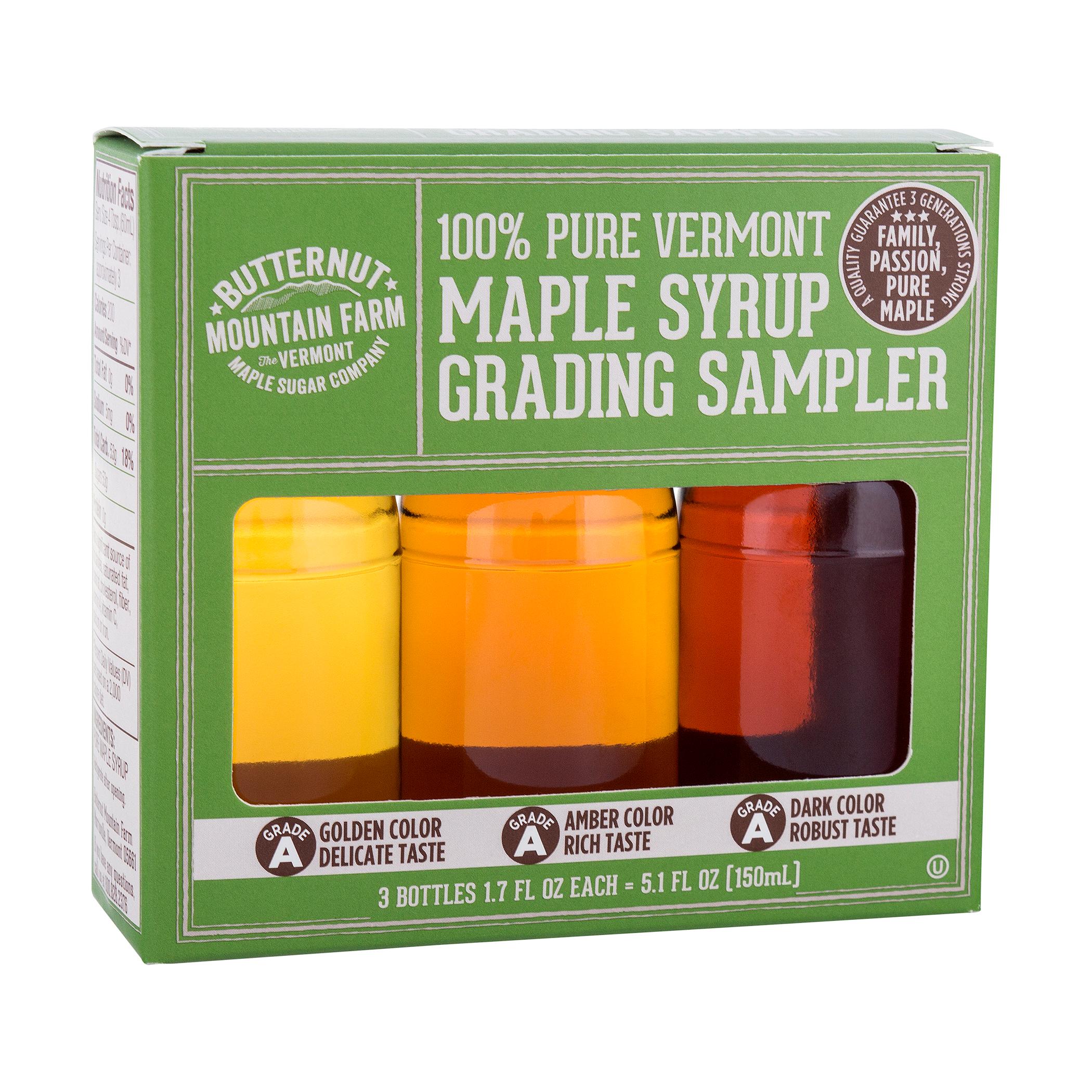 The Pure Vermont Maple Syrup Grade Sampler offered by Butternut Mountain Farm is a replica of the old Vermont Grading Sample Kits used by Sugarmakers for generations. Sample all the flavors of pure maple syrup, and then purchase the syrup flavor you enjoy the most. Contains samples of 3 Grade A syrups of golden, amber and dark color. Enjoy on toast, scones, and biscuits, or in a hot cup of tea.