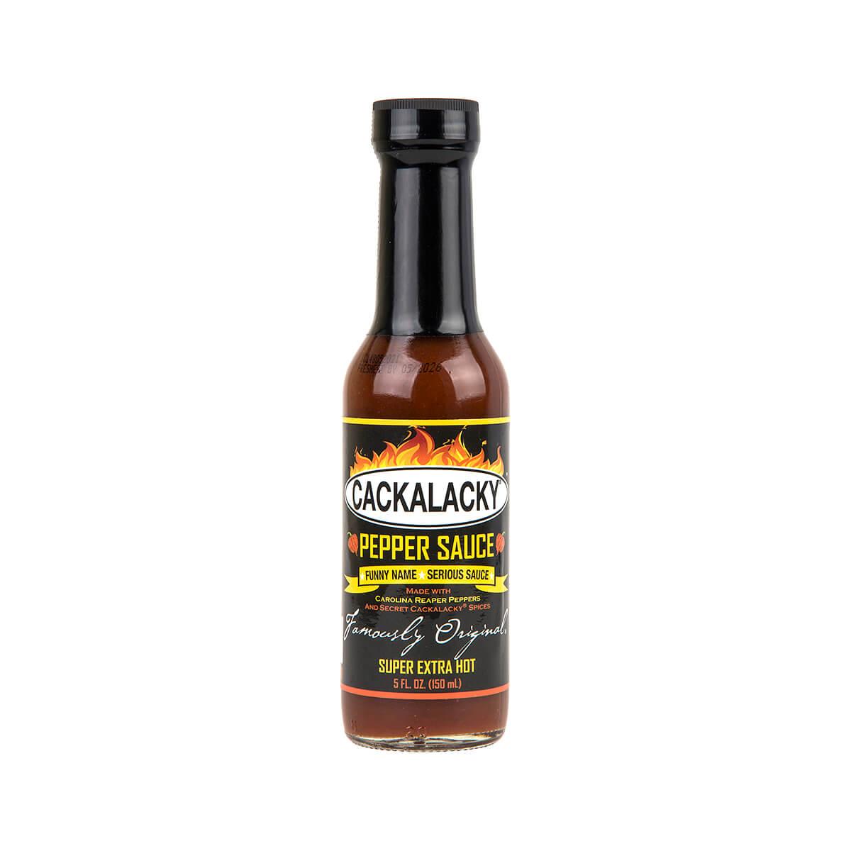 Brewed with Carolina Reaper chile peppers and Cackalacky's Famously Original® Secret Spice Blend, Cackalacky® Super Extra Hot Pepper Sauce is, as its name suggests, an extra-spicy version of their flagship gourmet Cackalacky® Pepper Sauce.
