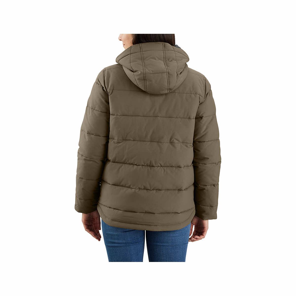 The Women's Montana Relaxed Fit Hooded Puffer Jacket from Carhartt will keep you warm all season long! Made from soft, durable Carstrong® quilted nylon, this outstanding outerwear blocks wind and sheds light rain for ultimate comfort no matter the weather. This excellent puffy coat is lined with plush Sherpa fleece and has elastic cuffs to trap heat where you need it most. Bundle up in style with this great jacket!