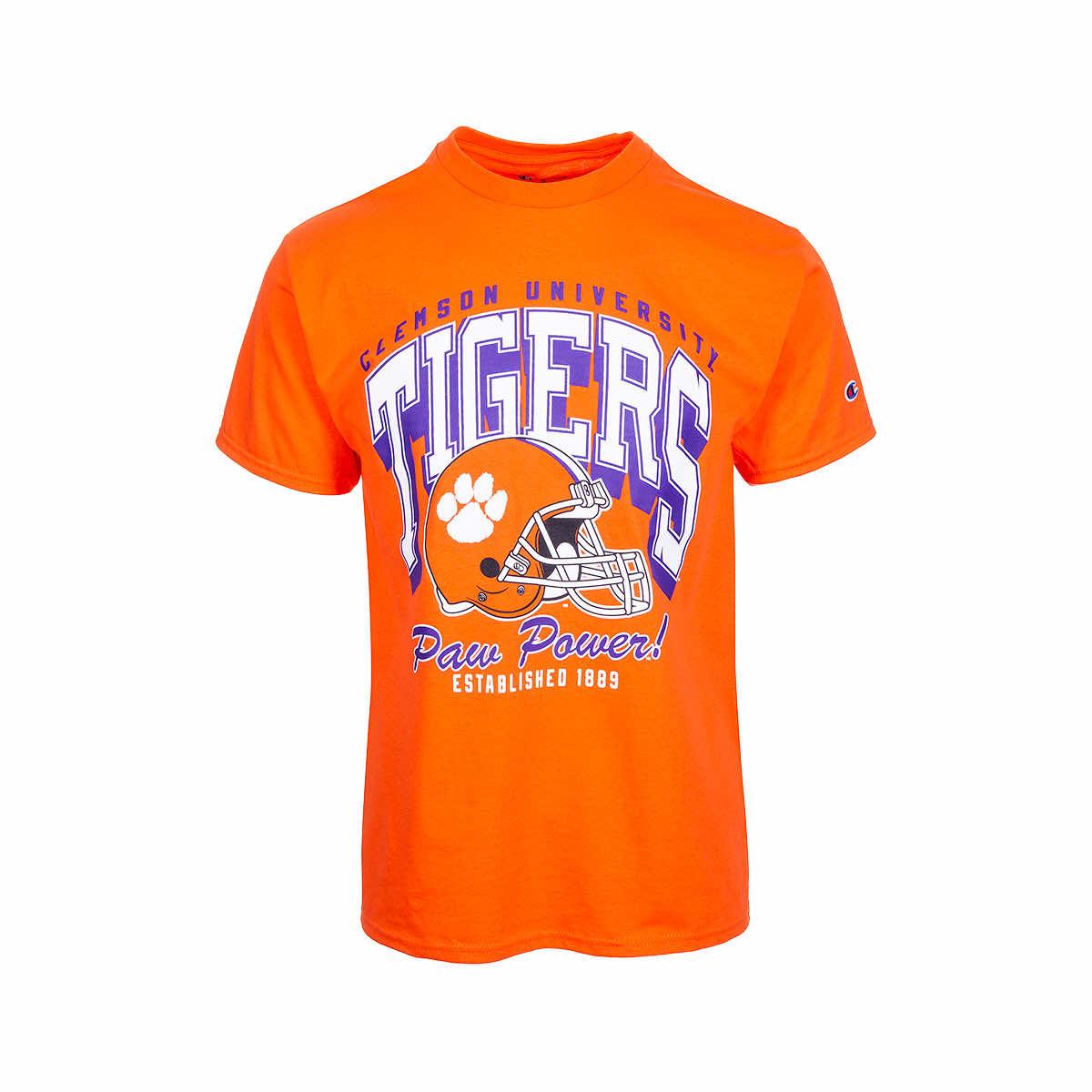 Tailgate in style with the Clemson University Tigers Helmet Short Sleeve T-Shirt from Champion! The classic crewneck design means that this great top will go with anything in your closet. Made from comfy 100% cotton, this excellent collegiate tee has a vibrant graphic on the front to help you cheer the Tigers to victory. Get ready for game day in this awesome t-shirt!