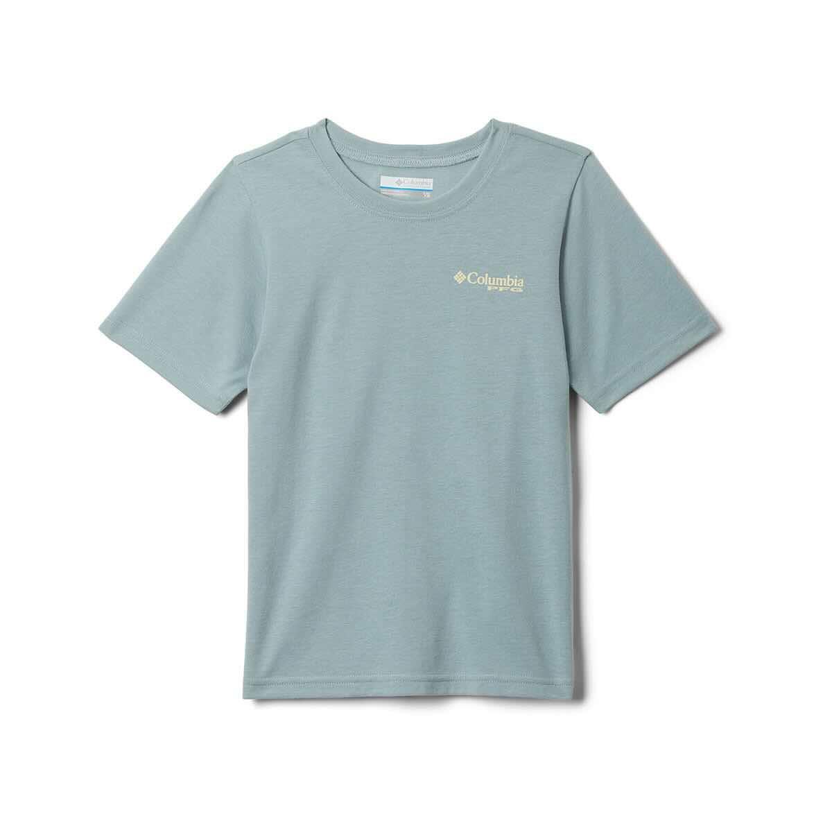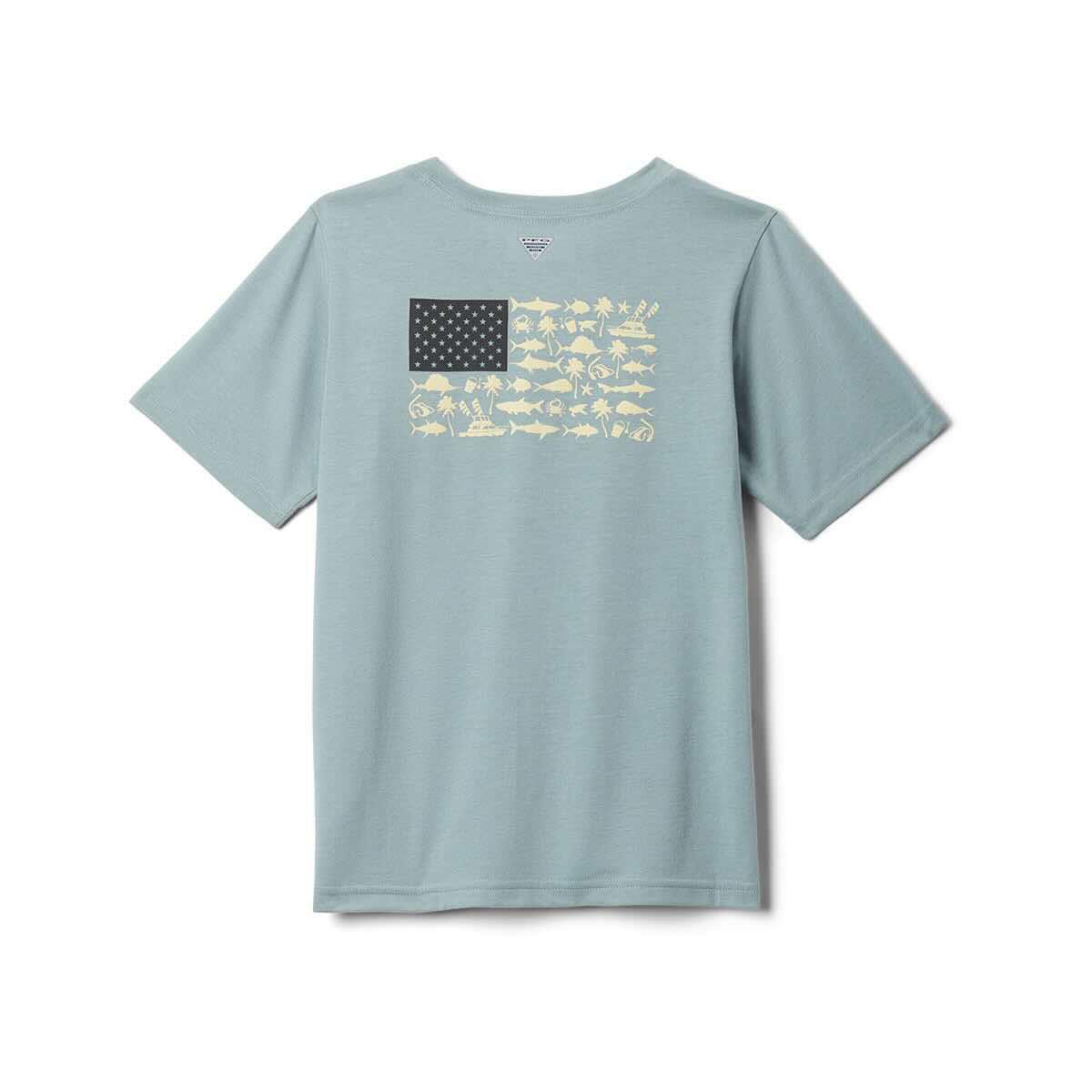 Outfit your young adventurer in the comfortable and stylish Boys' PFG Flag Short Sleeve Graphic T-Shirt from Columbia. This boys' short sleeve shirt features advanced Omni-WICK™ technology that pulls moisture away from the skin, keeping him cool and dry during all his activities. The eye-catching flag graphic t-shirt showcases his love for the outdoors and the PFG (Performance Fishing Gear) collection. Crafted from soft and durable fabric, this Columbia tee is perfect for fishing trips, playing at the park, or everyday wear. This boys' graphic tee is a must-have for any active kid.
