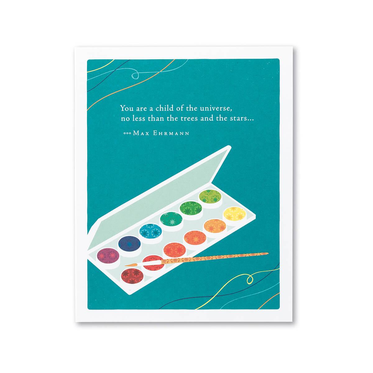 Reads: Outside - "You are a child of the universe, no less than the trees and the stars... -Max Ehrmann"; Inside - "You are a work of art. Happy birthday!"