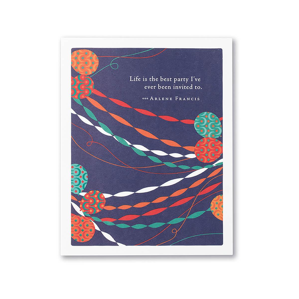 Reads: Outside - "Life is the best party I've ever been invited to. -Arlene Francis"; Inside - "And today the party is all about you. Enjoy your birthday!"