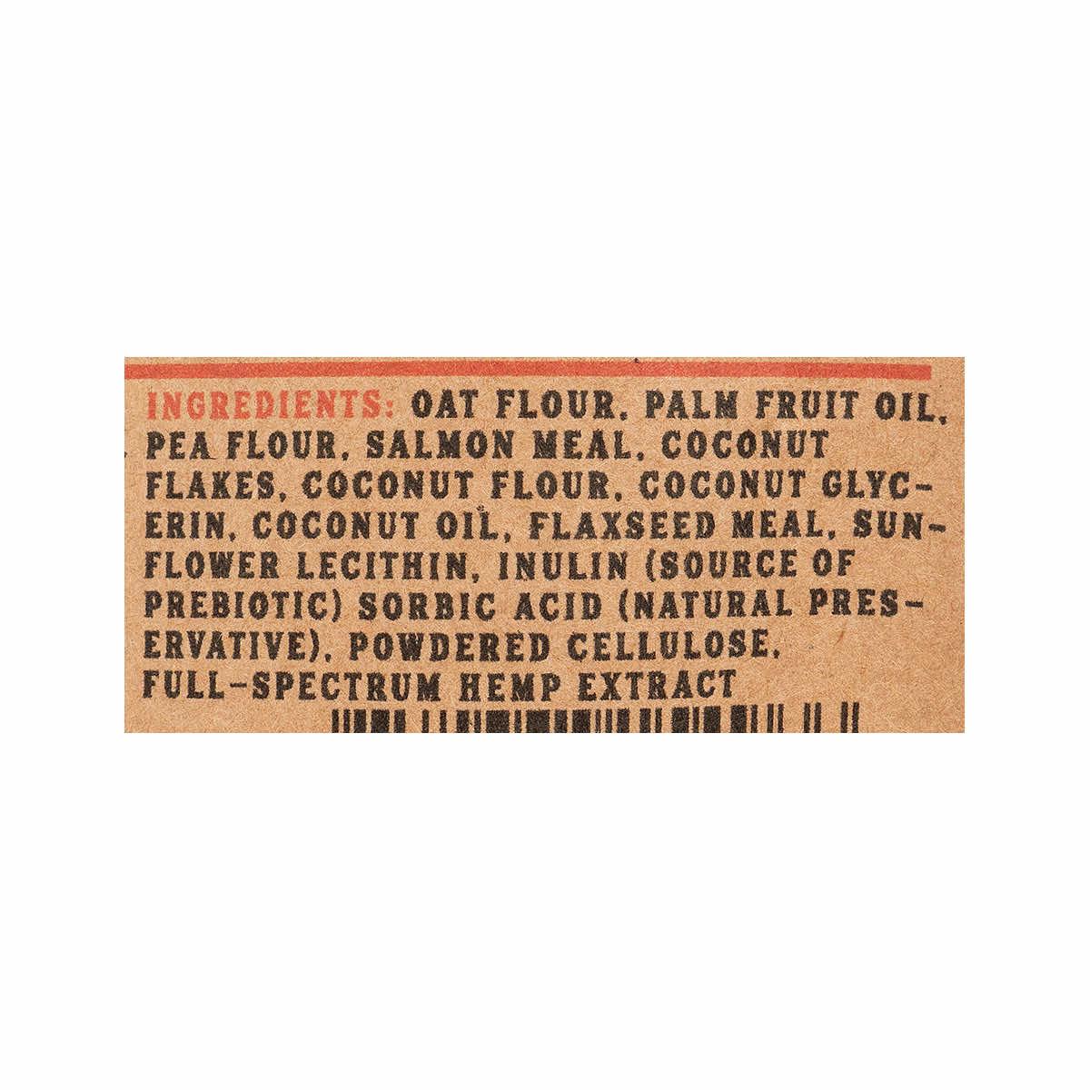 Ingredients: Oat flour, palm fruit oil, pea flour, salmon meal, coconut flakes, coconut flour, coconut glycerin, coconut oil, flaxseed meal, sunflower lecithin, inulin (source of prebiotic), sorbic acid (natural preservative), powdered cellulose, full-spectrum hemp extract