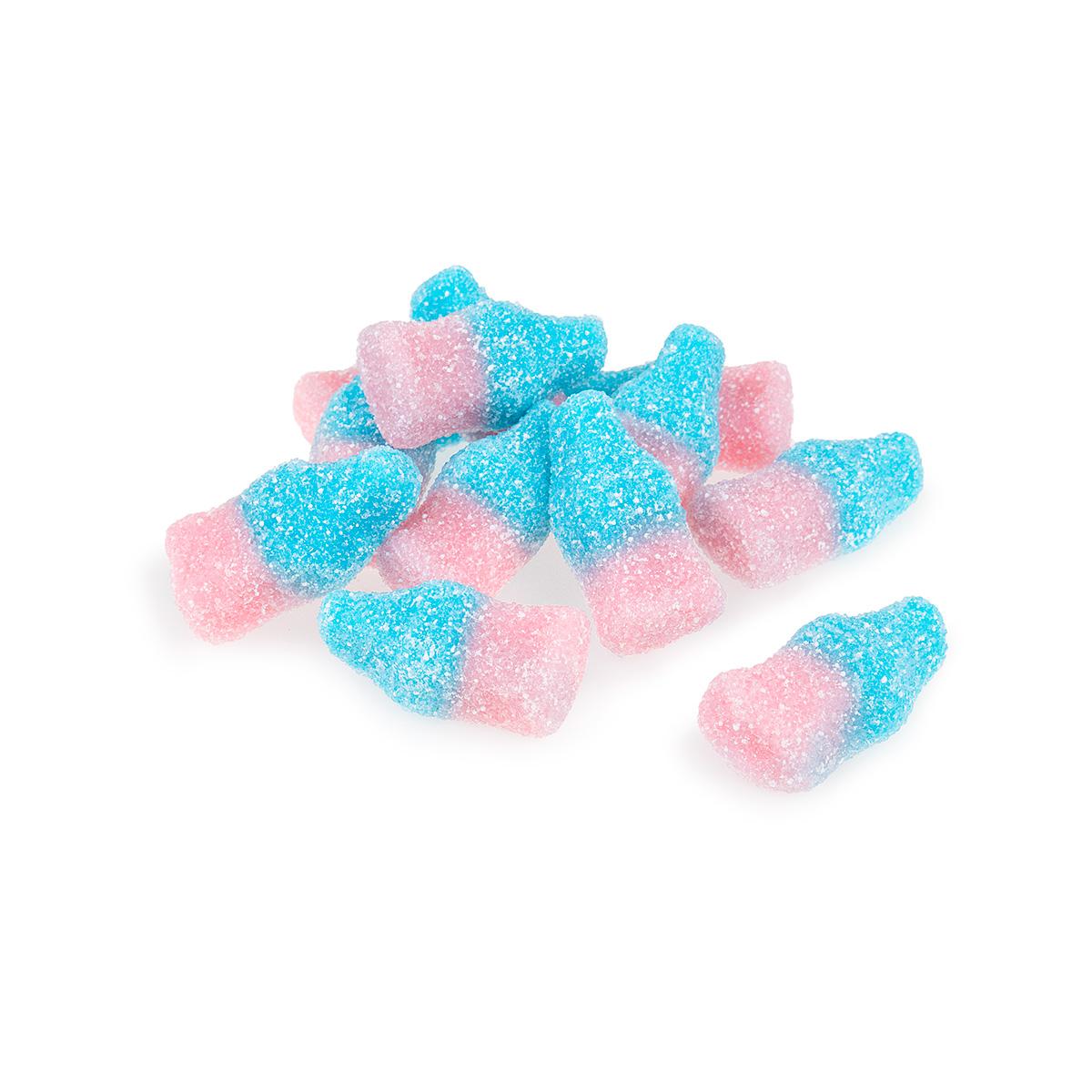 The sour start is always worth it for that sweet relief, and these Sour Gummi Bubble Gum Bottles are a delicious example! These blue and pink gummies are shaped to look like an old-timey soda bottle, coated in sour sugar, and filled with a taste bud tingling bubble gum flavor. They are great for snacking or sharing by the handful.