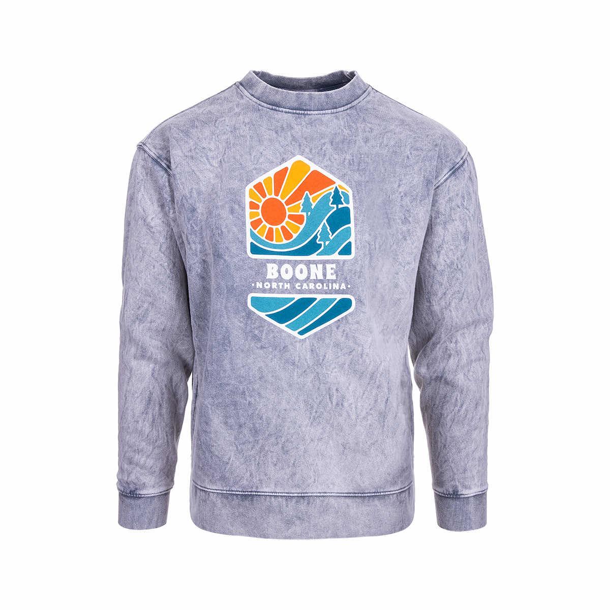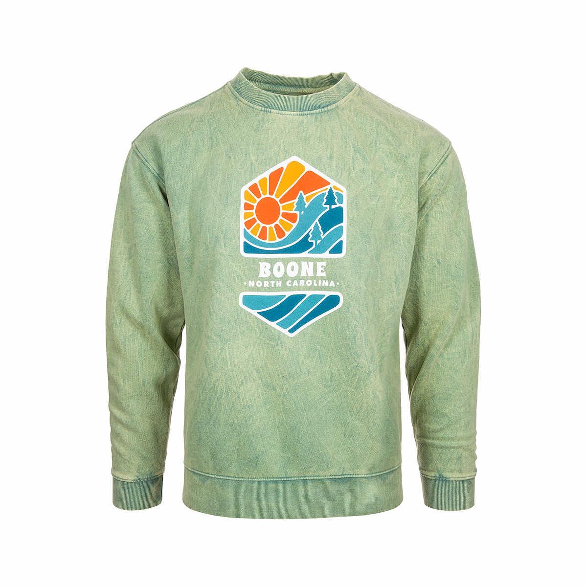From sunrise to sunset, fall in love with the High Country even more when you wear the Green Street Boone Split Screen Pine Crew Neck Sweatshirt, an incredibly comfortable crew neck top made from a sustainable cotton-poly blend. As the temperatures start to chill, experience the next-to-skin softness of this cozy pullover and keep the breeze at bay thanks to the fleece-lined interior. The front features a colorful graphic of the sun shining over hills and mountains with "Boone, North Carolina" printed in between. Soak up the memories made in Boone and enjoy the comfort of your new favorite pullover!