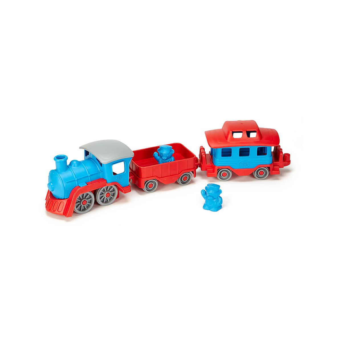 All aboard! The Green Toys Train is pulling out of the station! This sturdy locomotive is ready to chug along from one eco-friendly adventure to the next. Made in the USA from 100% recycled plastic milk jugs that save energy and reduce greenhouse gas emissions, the brightly-colored steam engine pulls two additional cars that link together to form a long train, or easily unhook for stand-alone play. The open wagon is perfect for hauling all kinds of sustainable cargo, while the caboose features a spacious interior and removable roof. Two conductor bear figures are included with the set, encouraging open play as little engineers' imaginations lay the tracks for all sorts of creative narratives. With no metal axles or external coatings, the Green ToysTrain is safe and versatile for both indoor and outdoor play, and is dishwasher safe for easy cleaning.
