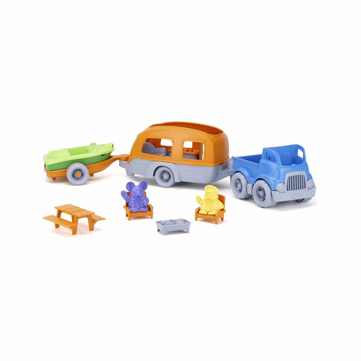 Time to hit the road in the Green Toys™ RV Camper Set Toy that is loaded up and ready for an adventure! This colorful, 3-in-1 vehicle playset has something for everyone, featuring a pick-up truck, spacious camper, and sport boat with its very own trailer. Play with them individually, or link them all together for two feet of fun! And don’t forget the accessories – two characters, two chairs, a picnic table, and a camping stove round out this 10-piece set with endless narrative play possibilities. Great for indoor and outdoor play, the super-safe design has no metal axles, exterior paints, or coatings.