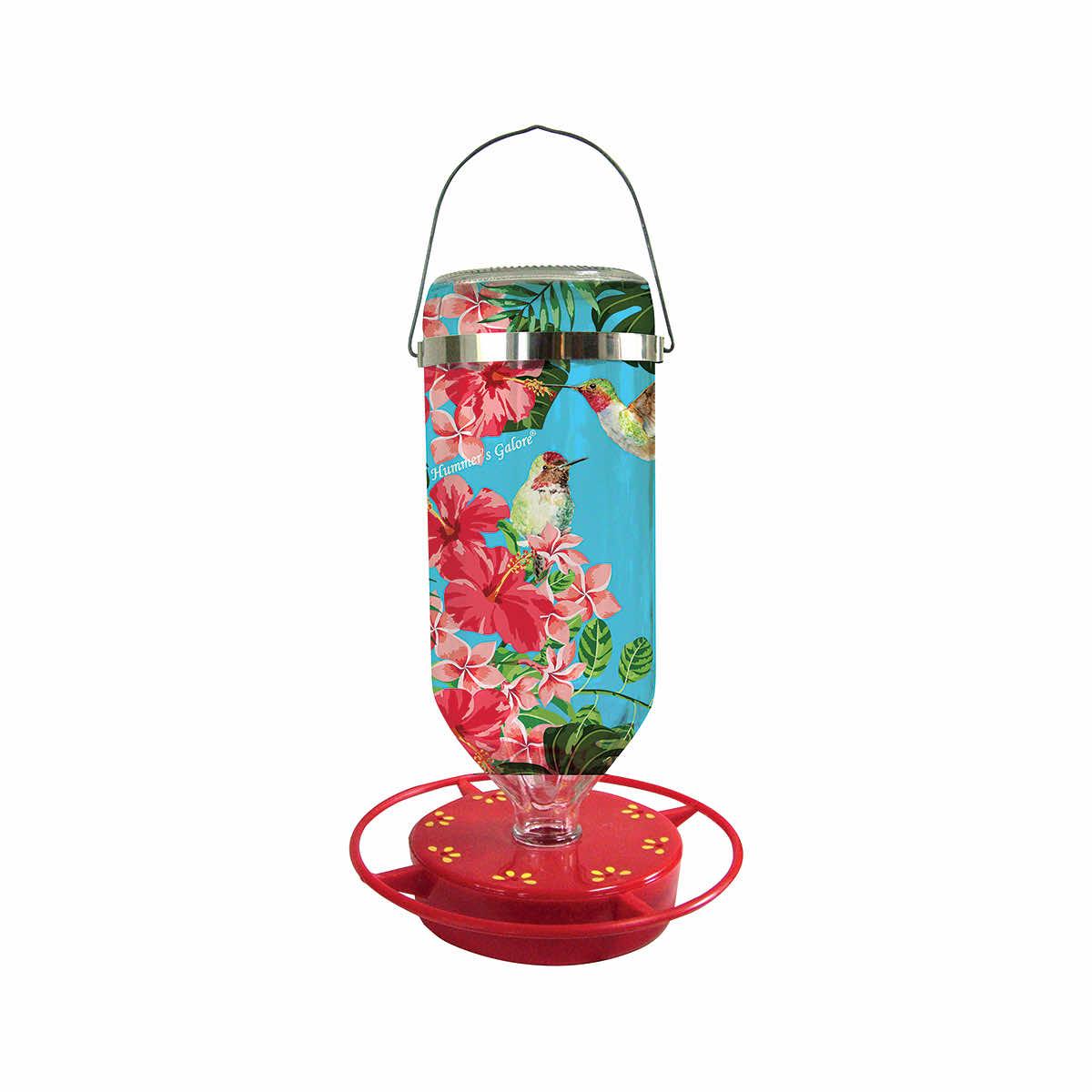 Your garden will buzz with delight when you have the Tropical Blue Sky Hummingbird Feeder from Hummer's Galore! This high-quality glass hummingbird feeder is enhanced by a vibrant floral print that will elevate your yard with its beauty. The two-part base includes eight feeding stations with a generous outer ring for safe perching and sipping for your hummingbird friends. This gorgeous and sturdy bird feeder will bring joy to your decor!