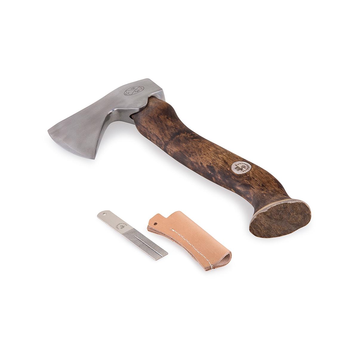 Stuorra 'Aksu translates to "Big Axe" in the Sami language. The Sami are known for their reindeer herding and lasso skills as well as their craftsmanship. This hunting axe is specifically designed to process game or domestic animals. The head is made from hygienic stainless steel and the joints are filled to make the axe easy to clean. The handle is a beautiful curly birch and comes in your choice of light or dark finish and features an inlaid reindeer antler with the Karesuando Kniven logo. The pommel is capped with sculpted moose bone.