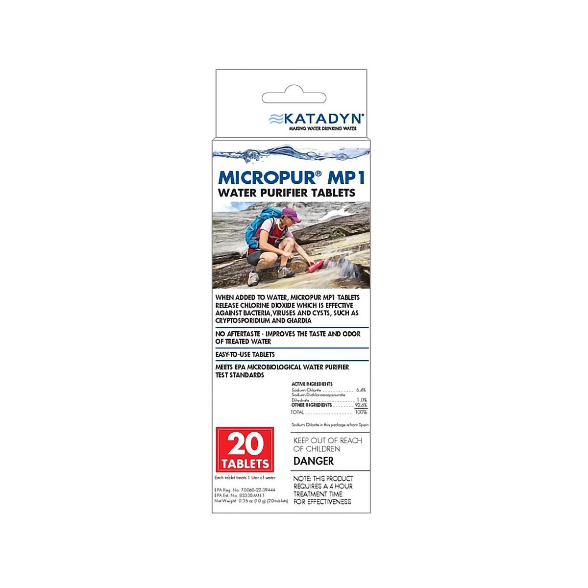 Micropur MP1 water purification tablets are only for emergency disinfection of drinking water. When used as directed, the tablets make contaminated water suitable for drinking. When added to water, Micropur MP1 tablets release chlorine dioxide which is effective against bacteria, viruses, and cysts, such as Cryptosporidium and Giardia. No aftertaste - improves the taste and odor of treated water.