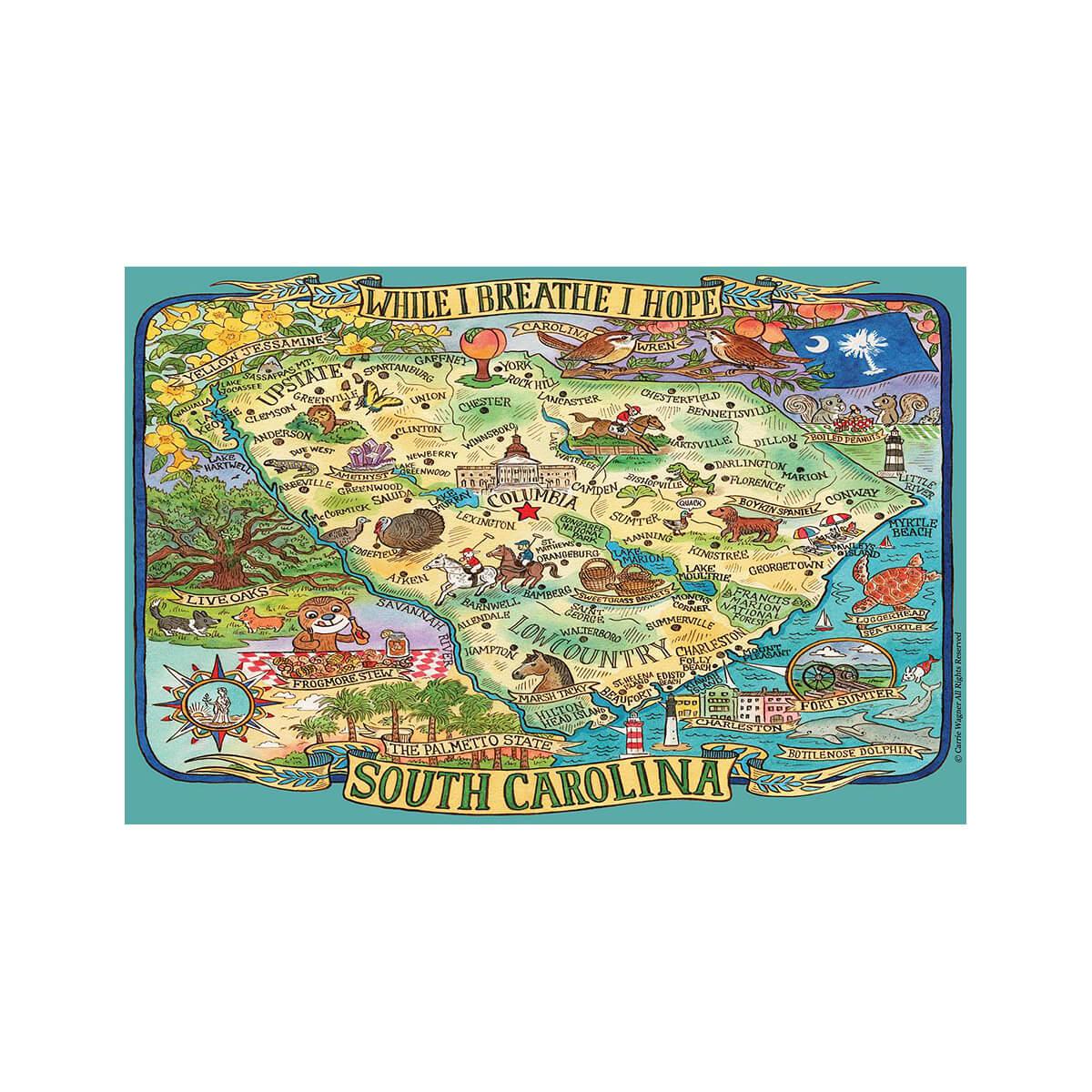Plan your next big adventure or reminisce over past explorations in the wonderful state of South Carolina with this Adventure Destinations South Carolina Map Kitchen Towel from Kay Dee. This kitchen towel is made of 100% absorbent cotton and features a hanging loop and artwork by Carrie Wagner of the state of South Carolina with colorful images of animals, must-see sights, foods, and much more.