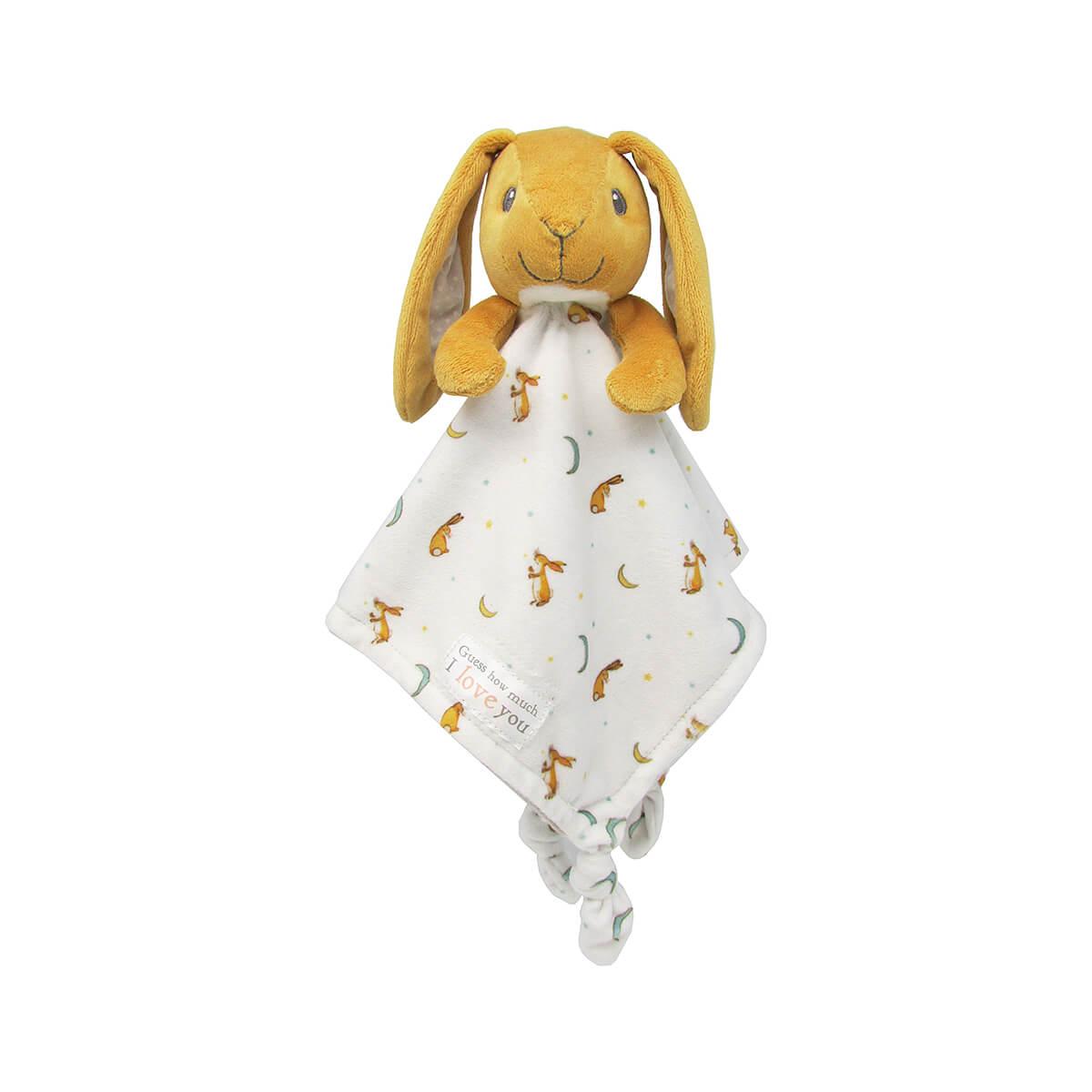 The Guess How Much I Love You™ Snuggle Blanky features the beloved Nutbrown Hare from the classic children's book from Sam McBratney. Your little bunny will love to cuddle and snuggle with this part plush, and part oh-so-soft cream blanky featuring the phrase "Guess How Much I Love You" embroidered on the tag of the sweet bunny blanky. Baby will love to soothe with the knotted blanky ends, and will delight with the bunny print with moons and stars of this security blanket and plush in one.