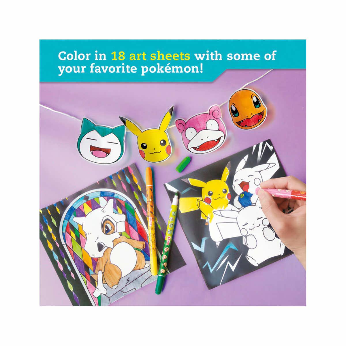The Pokemon Stained Glass Art Book from Klutz features special vellum paper that lets you color in 18 pieces of Pokémon art that look like stained glass. Use the included double-tipped markers in 10 custom colors. Then hang your artwork in a window and watch it light up! Each design is double-trouble. Color the stained glass vellum pages for your windows, and the paper pages for your walls. The artwork features Pikachu, Eevee, Charizard, and many more. Plus, learn fun facts about some of your favorite Pokémon!