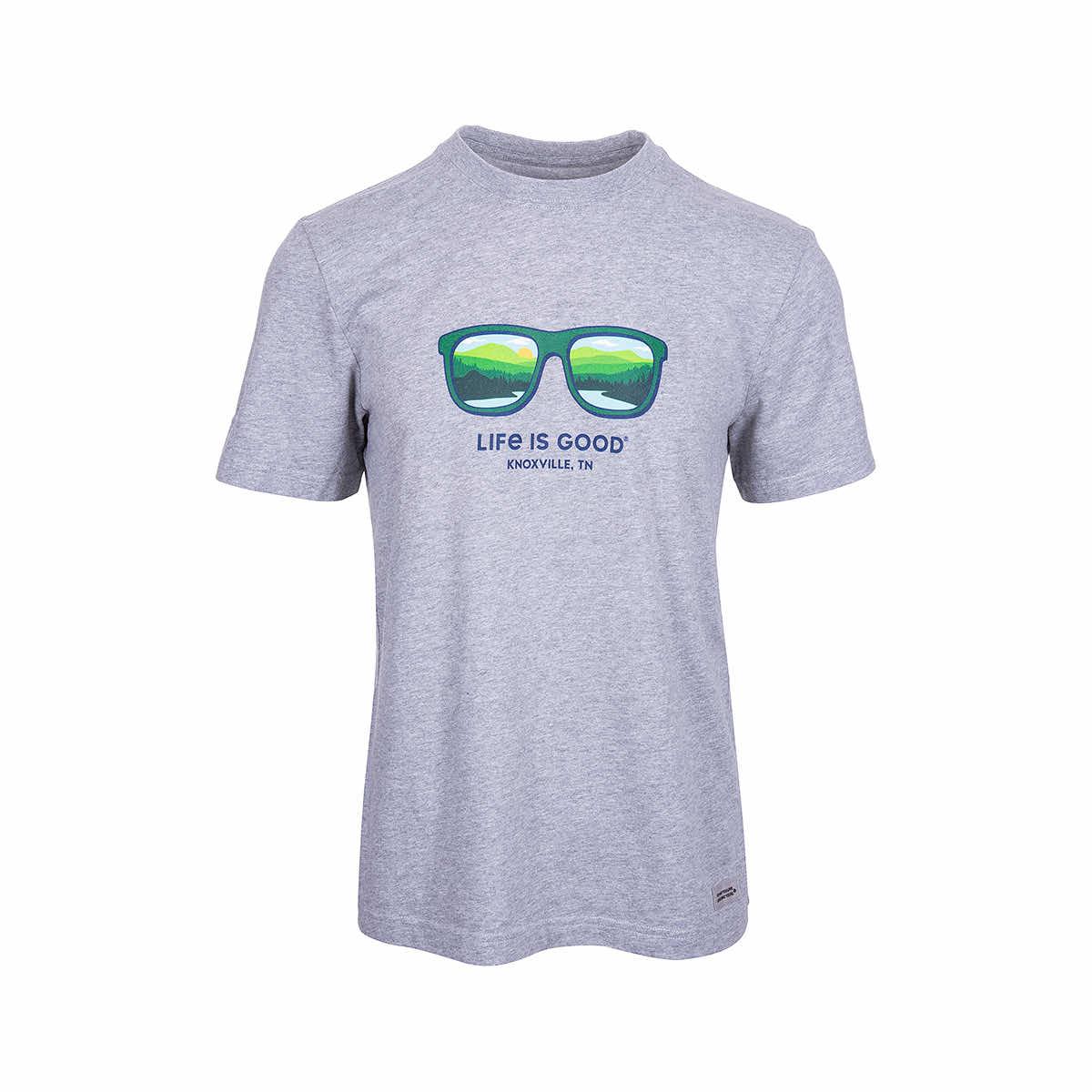 Take a gander through the lens of good times and fun adventures in the Men's Knoxville TN Sunglasses Short Sleeve Crusher T-Shirt from Life is Good. Made from super-soft USA-grown cotton that has been garment-washed for texture and fit, this tee doesn't mess around when it comes to comfort. The fun graphic on the front features sunglasses reflecting an amazing mountain river landscape with "Life is Good Knoxville, TN" printed underneath. This t-shirt is comfy and soft for soaking up the sunshine on your favorite river!