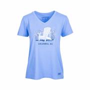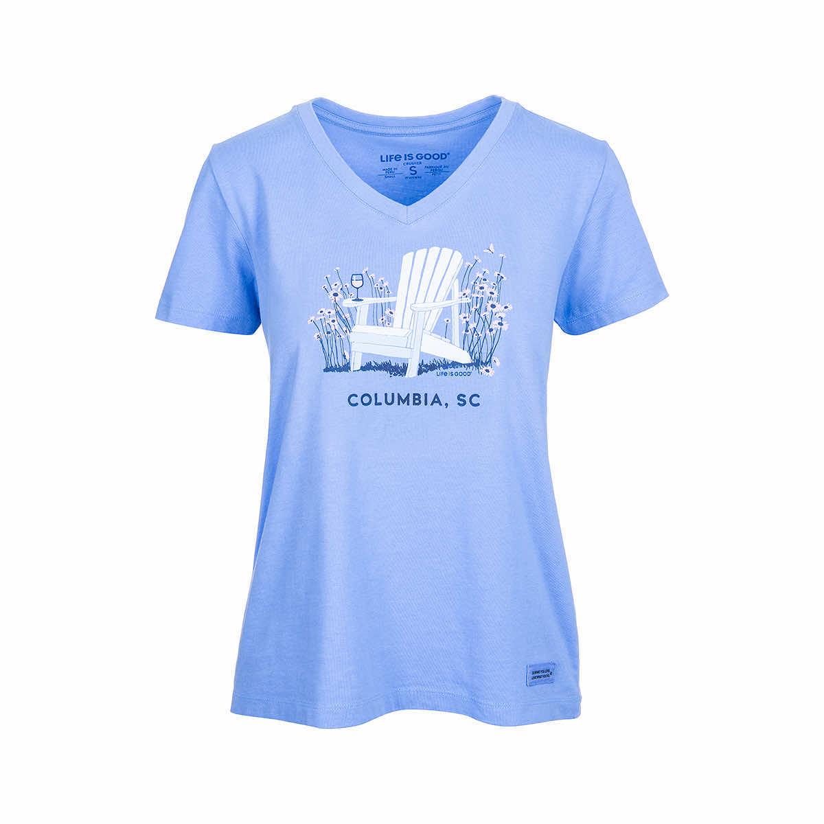 Treat yourself to beach vibes and the comfort of lightweight fabric with the Women's Columbia Wildflower Adirondack V-Neck Short Sleeve Crusher T-Shirt from Life is Good. This short-sleeve tee is crafted from 100% cotton, which has been garment washed for extra softness against your skin. The slight waist shape paired with taping from the shoulders provides a feminine fit that is perfect for everyday wear to shoreline retreats. It features a printed graphic on the front of an Adirondack among flowers with a glass of rosé and celebrates Columbia, South Carolina. Take a moment after exploring to smell the flowers and enjoy the laid-back feel of this t-shirt.