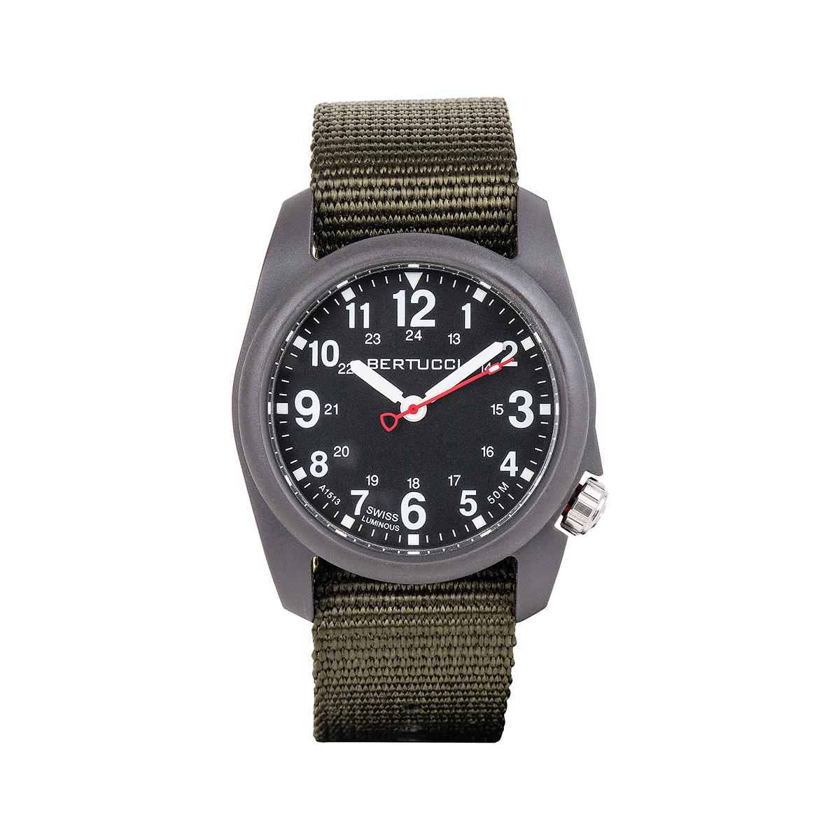 The M. H. Bertucci DX3 Field Watch offers classic design, a rugged U.S. Patented Unibody™ fiber-reinforced 40 mm case and a long list of performance features... including a scratch-resistant R-Type mineral crystal, offset ergonomic crown, long-lasting precision movement, 4-year battery, 50 M water resistance, B-Type nylon webbing band, and Swiss super luminous hands & markers. The easy-to-read dial and comfort make the DX3 Field Watch a great to go to watch.