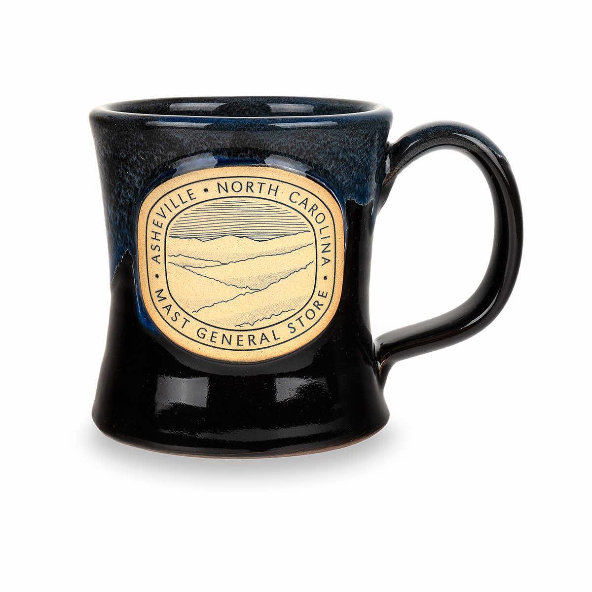 Enjoy that first steaming cup of coffee in this crafty Mast General Store Asheville NC Pottery Diner Mug that was hand-thrown right here in the USA. Each one is special in its own way and no two are going to be exactly alike. Featuring the rolling mountains of Asheville and the print border that says "Mast General Store • Asheville • North Carolina". Hold it tight on a cool night sipping tea, or grab onto the handle as you rush around the house— either way, this mug may soon be your favorite.