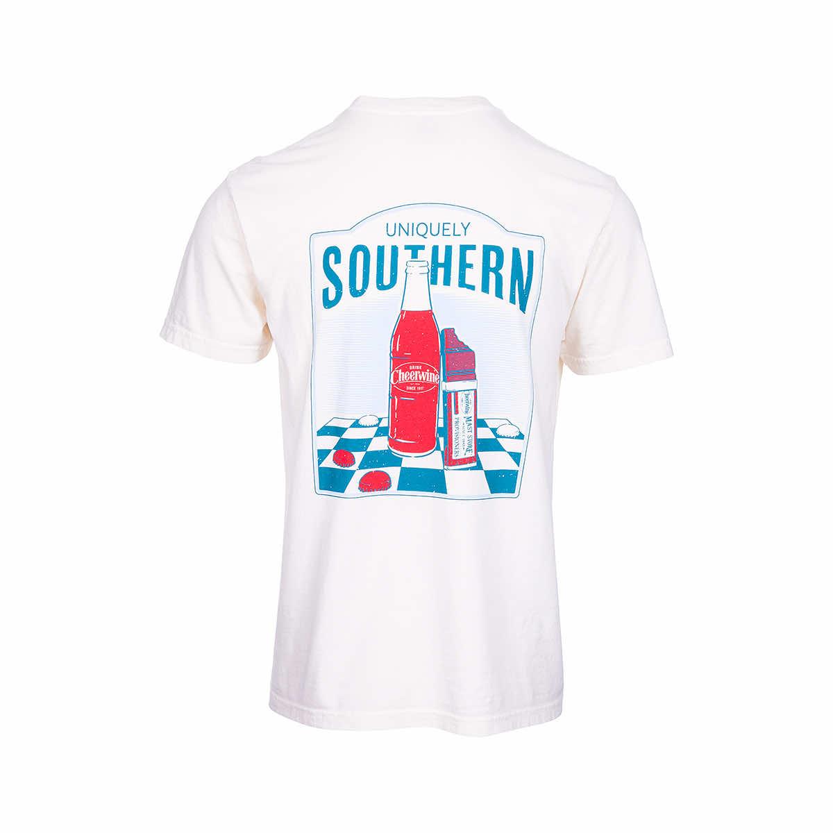 Wave the checkered flag on the checker match, the Mast General Store Uniquely Southern Short Sleeve T-Shirt is the winning move for unlocking your new favorite combo in the south! Made from an ultra-soft 100% ring-spun cotton fabric, enjoy a laidback fit with a trusty and dependable feel all season long. This short-sleeved tee features a Mast General Store logo on the front left chest and has a large graphic of a bottle of Cheerwine and a Mast Store Provisioners Cheerwine Milk Chocolate Bar sitting on a checkerboard. It isn't a secret that Cheerwine is a must-have beverage on a warm summer's day, but if you pair a bottle of that delicious cherry drink with a tasty Cheerwine Milk Chocolate Bar, then your tastebuds will be playing chess and not checkers. That's a checkmate on a Uniquely Southern staple!