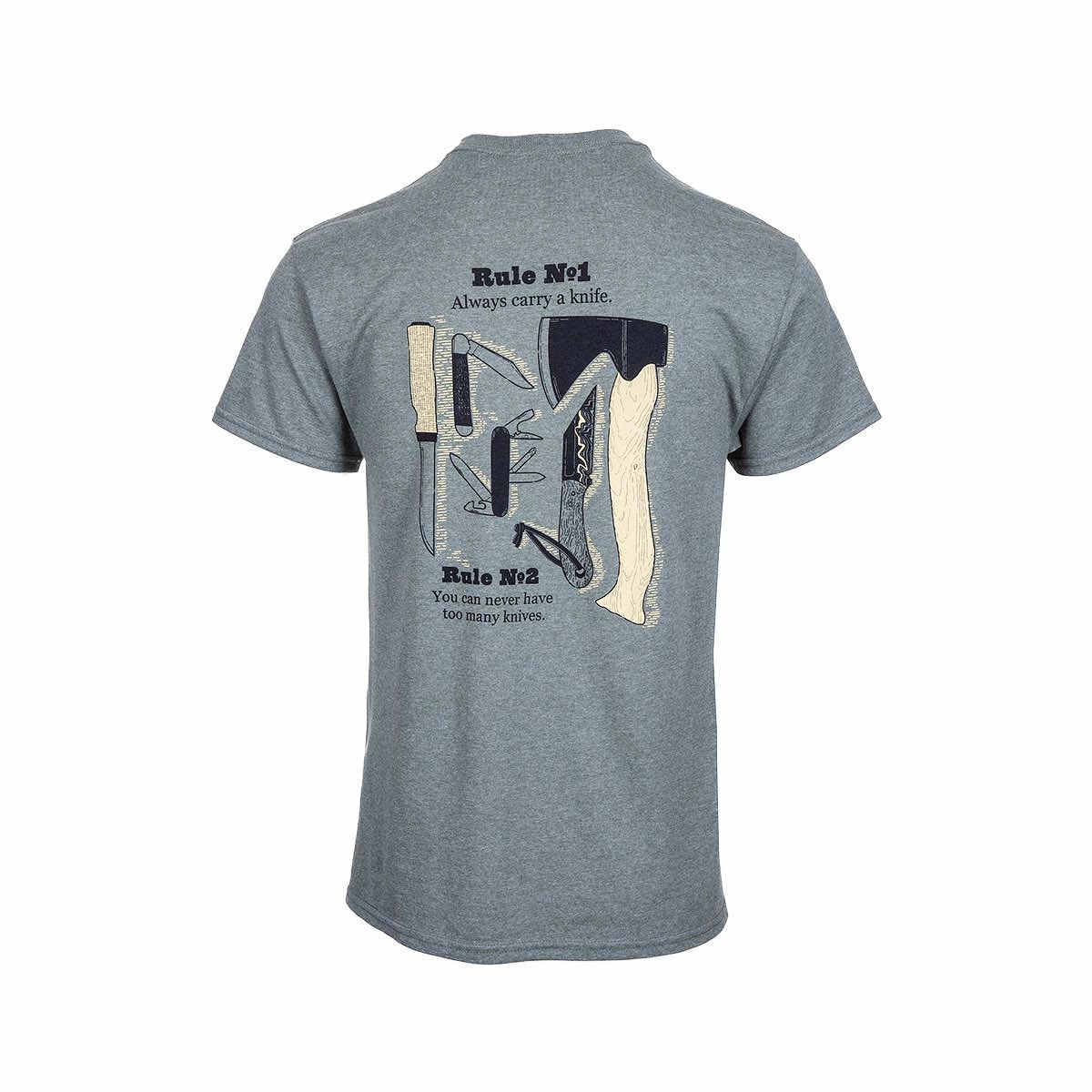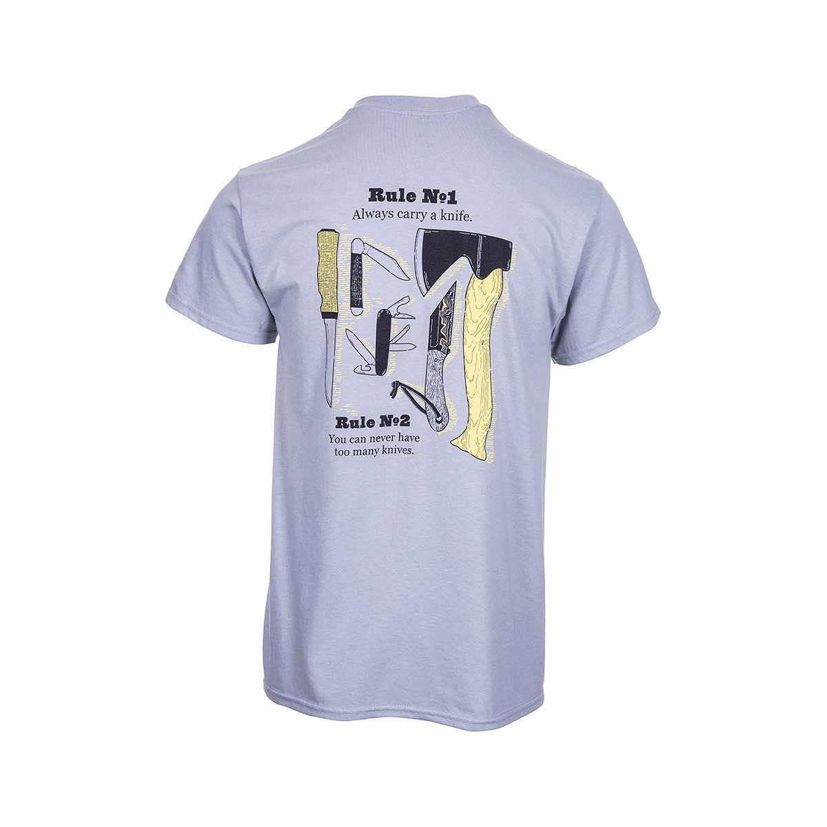 - "Rule No. 1 Always carry a knife. Rule No. 2 You can never have too many knives." printed on the back