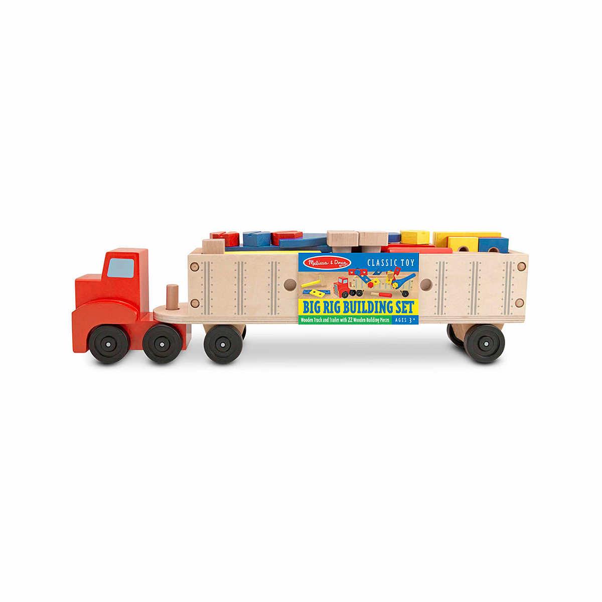 This tough, two-piece Big Rig Building Truck Wooden Play Set Toy from Melissa and Doug is ready to roll . . . and ready to build! Packed with wooden construction pieces and pre-drilled with holes for the wooden nails and bolts, the truck itself is a moving building site. Connect the painted building boards to create brightly colored structures on wheels! The building toy's 22 wooden toy pieces - including a hammer, screwdriver, wrench, board, nails, nuts, and bolts - store away inside the trailer to keep your little builder's supplies organized for the next big job. The Big Rig Building Truck Wooden Play Toy is great for fine motor skills, hand-eye coordination, and problem-solving, and encourages imaginative play and manual dexterity.