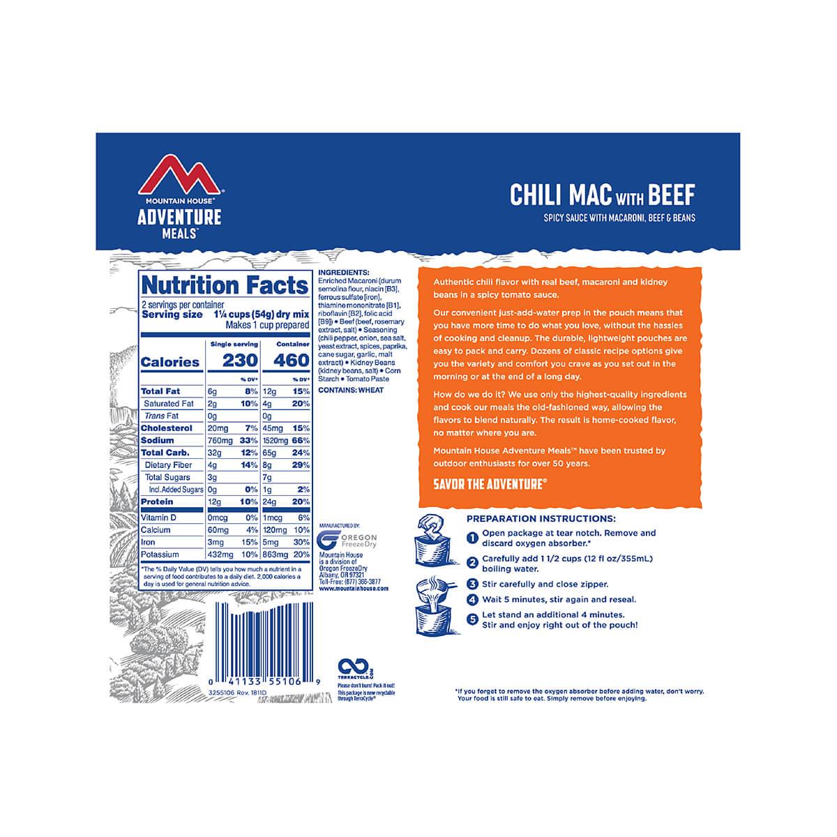 Nothing makes you feel more at home than a bowl of Mac 'n Cheese, and this Chili Mac with Beef from Mountain House is sure to bring the comforts of home to the trail or campsite. Easy to make, simply stir in 2 cups of boiling water, let stand, and enjoy it straight out of the pouch! Feel closer to home, anywhere in the world.