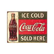 Revisit a bygone era with the Ice Cold Coca-Cola 1916 Tin Sign from Desperate Enterprise! This beautifully vintage metal sign is reminiscent of summer days at the gas station, drinking Coke Classic out of a glass bottle. Hang this delightful retro wall art in your home to channel some of Coca-Cola's effortless cool. Beat the heat with an ice-cold beverage, and beat boring home decor by hanging this incredibly awesome tin sign!