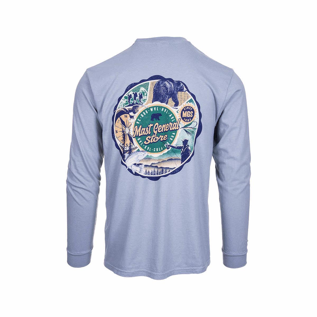 Rooted in our love for getting outside, the Mast General Store Since 1883 Long Sleeve T-Shirt from High Range highlights the great ways to get some fresh air! Adventures in nature are a stone's throw away from all of your favorite Mast General Stores. Spin the wheel and have your pick from hiking, biking, fishing, observing local wildlife (keep a safe distance!), camping, and so much more. Made of comfy 100% cotton, this long sleeve has a ribbed crew neck and a classic fit. The printed graphic on the left chest and on the back features a wheel of outdoor activities. Keep the Mast General Store Since 1883 Long Sleeve T-Shirt and enjoy your journey through nature!