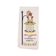 Dishtowel reads "HEY LADY!!! your birdfeeder is EMPTY".