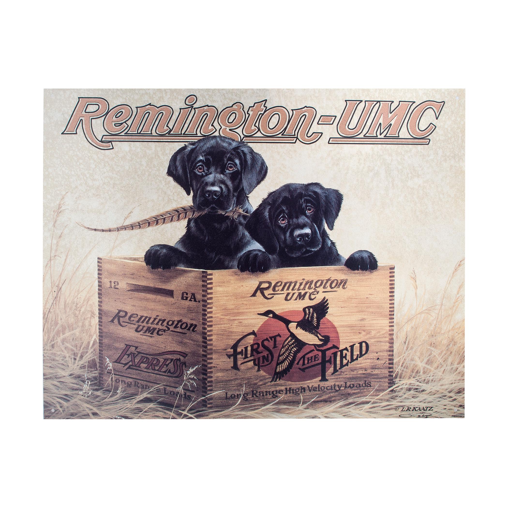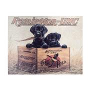 You won't be able to resist the precious pups on the Remington Finders Keepers Tin Sign from Desperate Enterprise! This wonderfully vintage wall art will fit perfectly into your rustic home decorating scheme. Hang this handsome metal sign in your cabin and effortlessly channel retro-cool vibes. Made in the USA to brighten any room in your house with country charm, you'll love to display this tin sign!