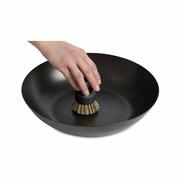 - Scrubs stuck-on food without harming the seasoned surface; curved bristle head allows full contact inside domed pans for effortless cleaning