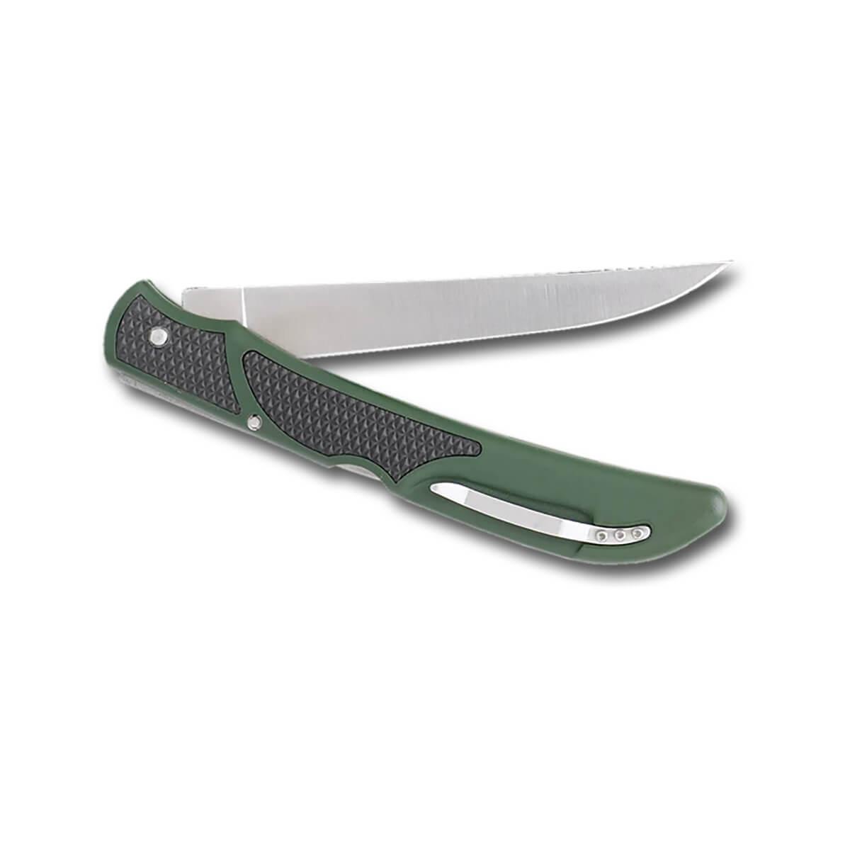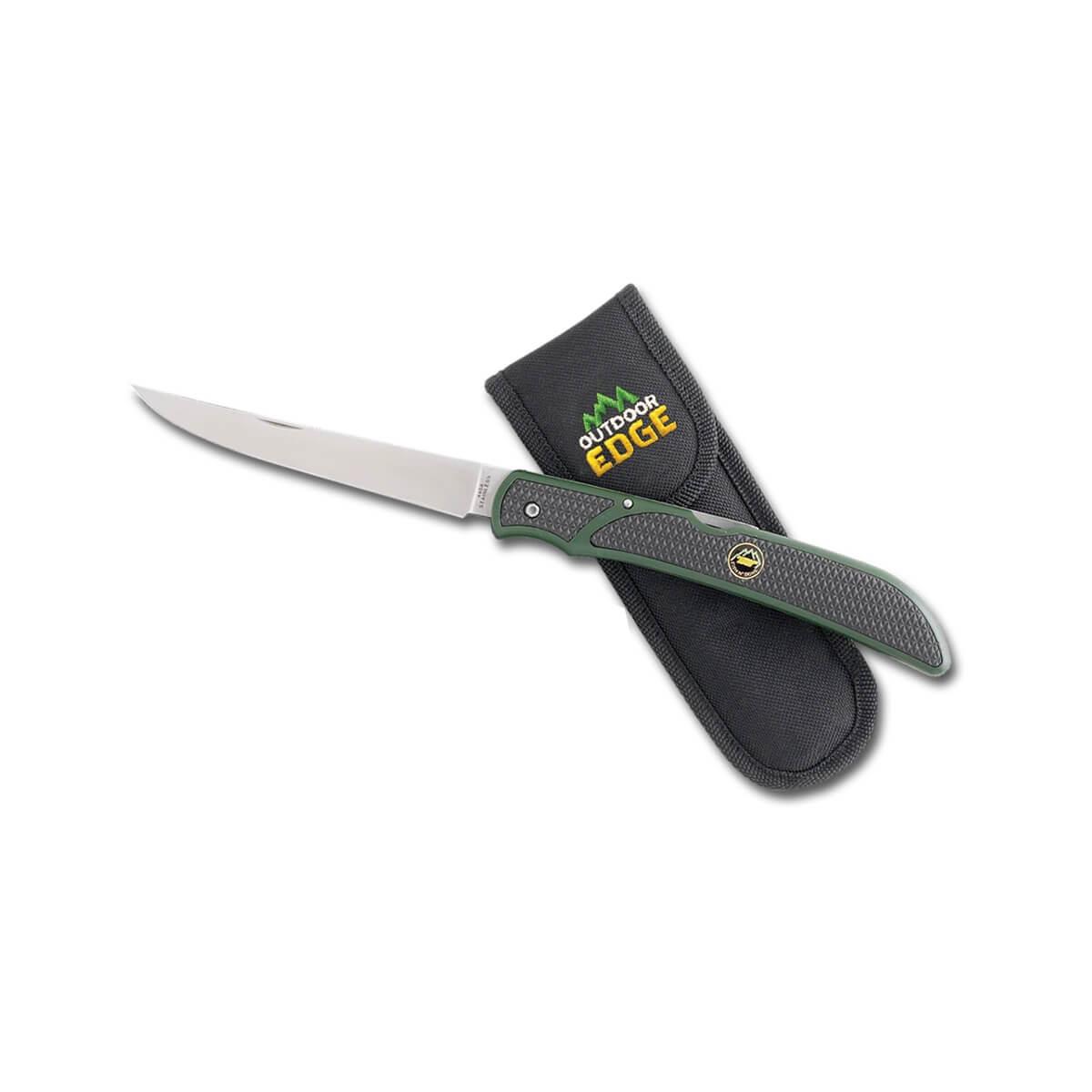 The Fish & Bone Knife from Outdoor Edge is a versatile folding knife for filleting fish and deboning big game. The flexible 5-inch 440A stainless steel blade is hand-finished shaving-sharp and double-tempered for superior edge retention and flexibility. The double-molded Zytel handle features rubberized, non-slip TPR inserts for a secure, non-slip grip, even when wet. Comes complete with a black nylon sheath and a pocket clip.