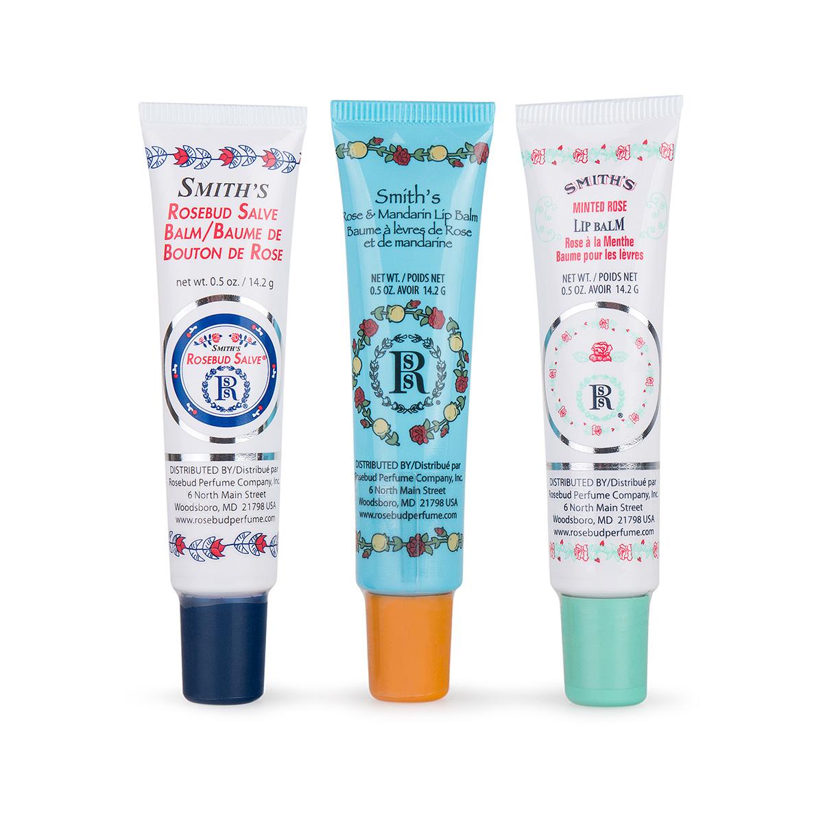 - Includes 3 tubes: 0.5-ounce Smith's Rosebud Salve Tube, 0.5-ounce Smith's Rose Mandarin Lip Blam Tube & 0.5-ounce Smith's Minted Rose Lip Balm Tube