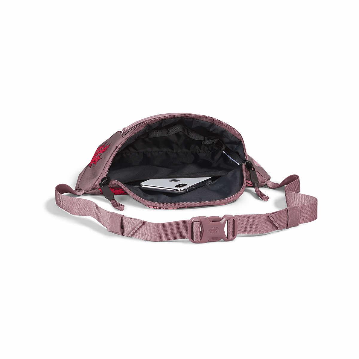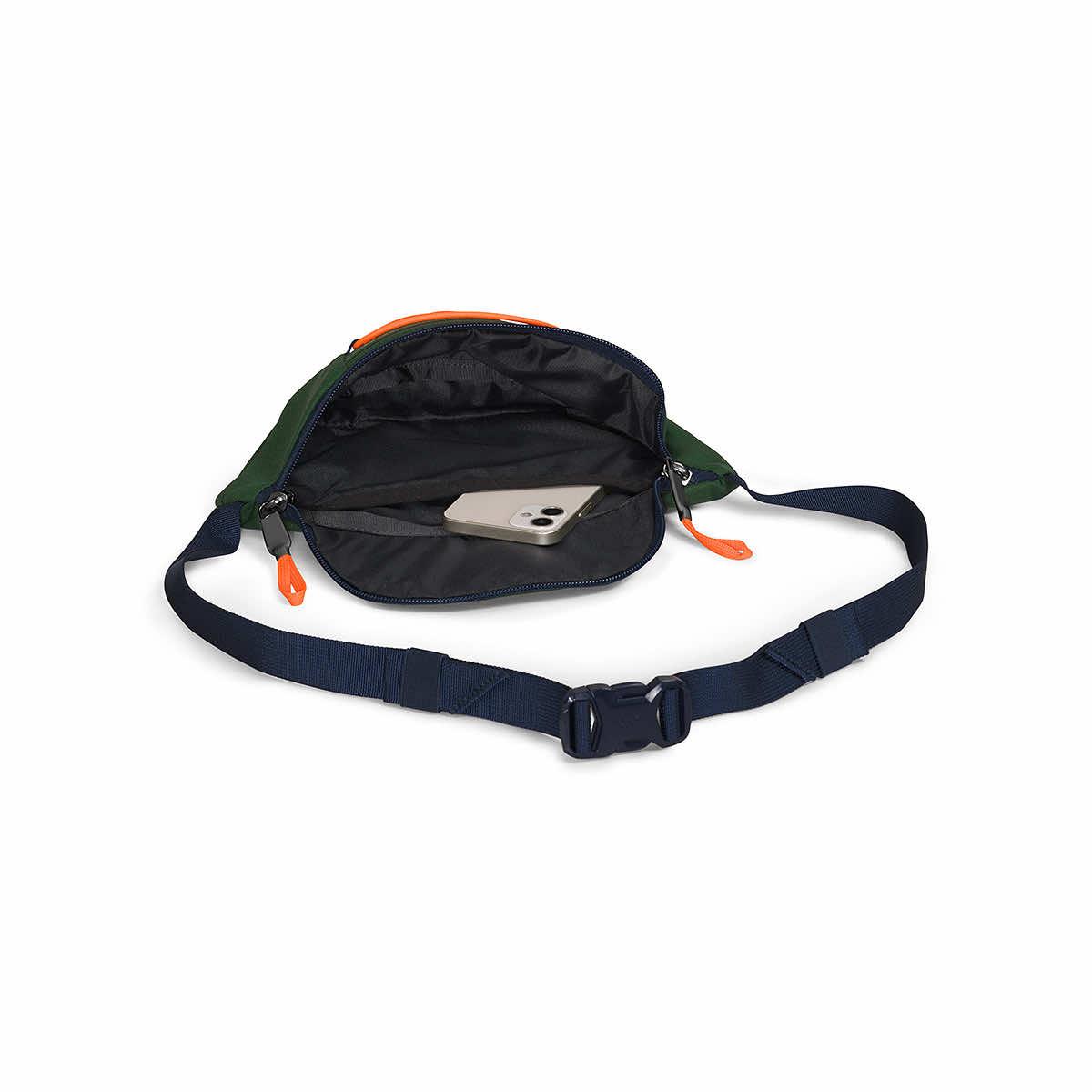 - Adjustable webbing strap allows for both a waist and crossbody carry