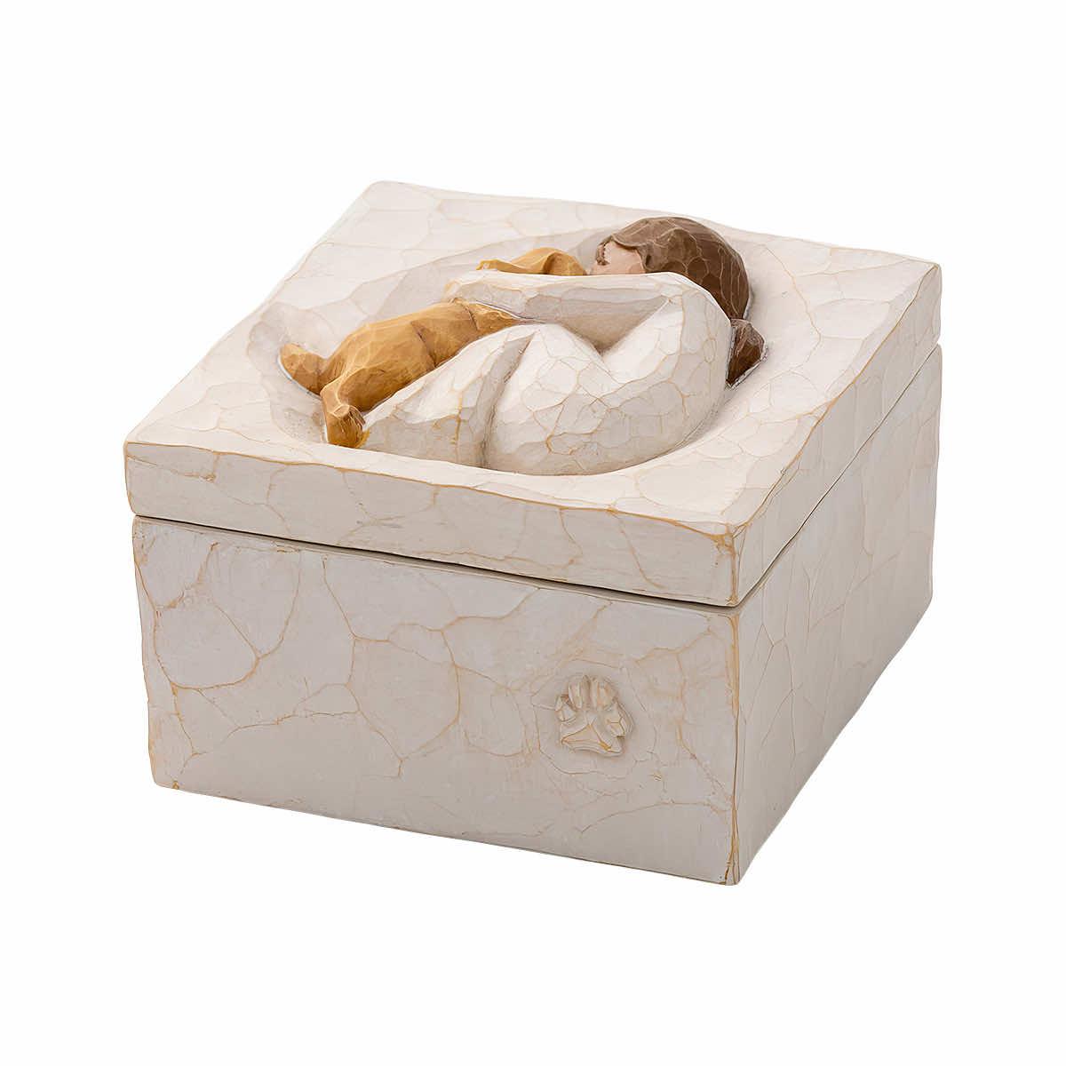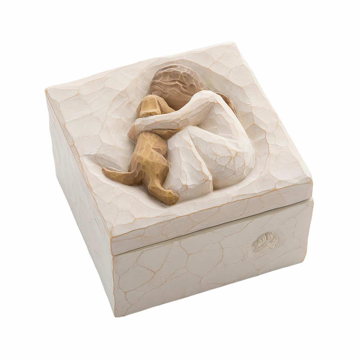 Celebrate friendship with your four-legged friends while keeping small items safely stored away with this True Keepsake Box from Willow Tree. Perfect for rings, other small jewelry, beads, seashells, and other trinkets, this keepsake box has been hand-painted and features a carving of a person embracing a dog on the lid.