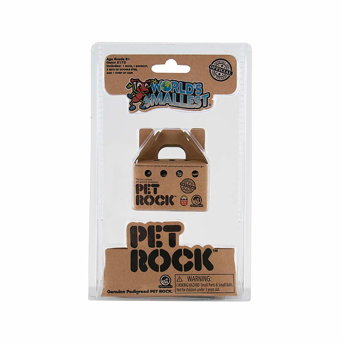 The World's Smallest Pet Rock features a genuine pedigreed pet rock in the world’s smallest size! Use accessories to design your custom Pet Rock, or go commando, just like the original! Includes Pet Rock to call your very own, a care and training manual, authentic paper nesting, 2 sets of googly eyes, and fuzzy hair. This little friend is a perfect Easter basket stuffer, stocking stuffer, party favor, and more!