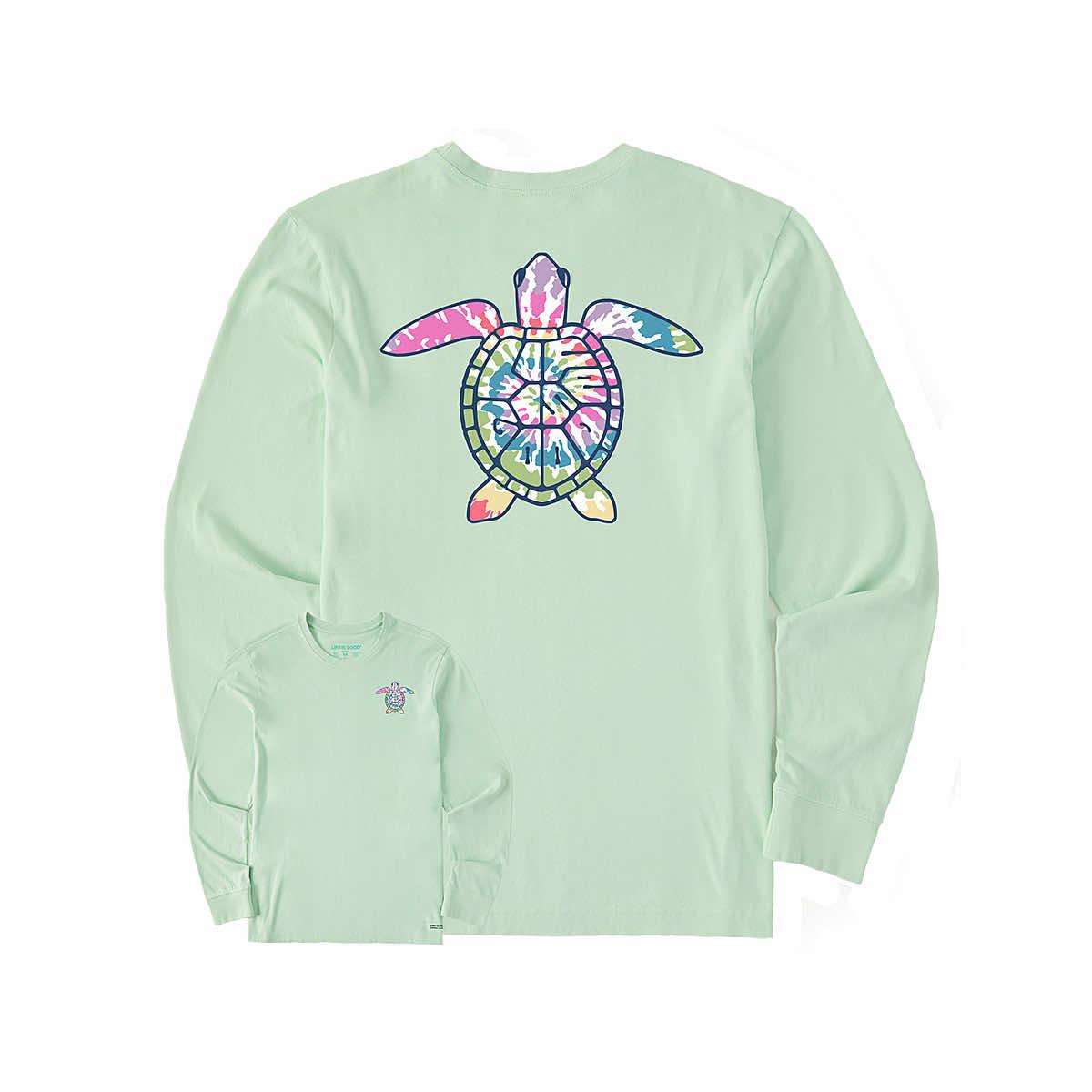 Get groovy in the Women's Tie-Dye Turtle Long Sleeve Crusher Lite T-Shirt from Life is Good! Made from 100% USA-grown cotton, this excellent tee is garment-washed for the ideal fit and softness. The fun and vibrant graphics on the front and back feature a radical, tie-dyed sea turtle who is here to spread good vibes. This t-shirt gives off good vibrations!