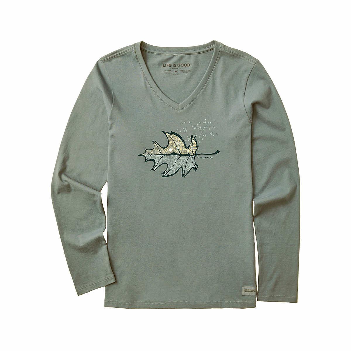 Channel fall fashion in the Women's Autumn Leafscape V-Neck Long Sleeve Crusher T-Shirt from Life is Good! This delightful long-sleeved tee is made from 100% USA-grown cotton and garment-washed to the ideal fit and softness. The intricate graphic on the front features the outline of a leaf with a mountain scene inside of it, complete with a flying flock of birds. This t-shirt is instantly charming!