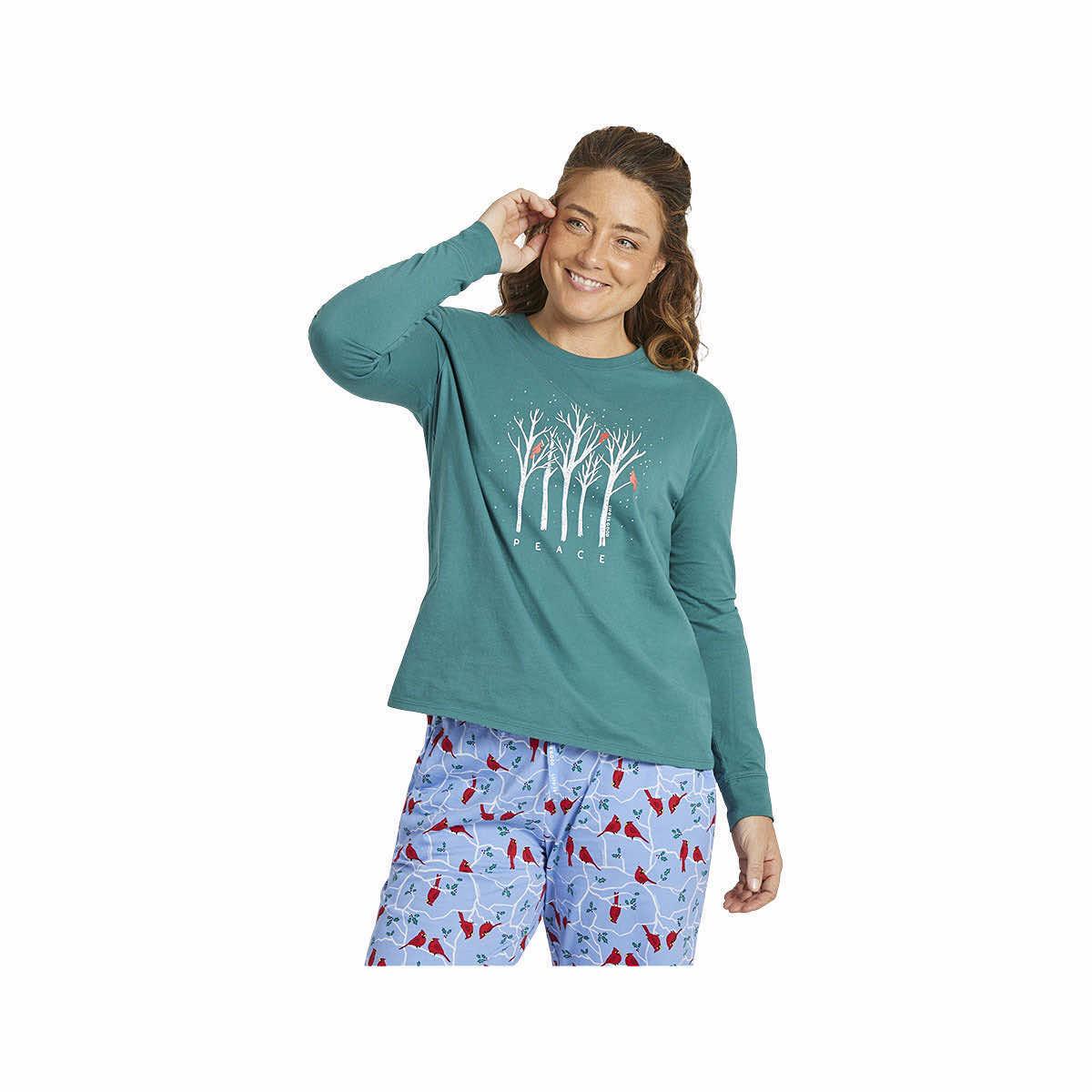 Stick together with your birds of a feather in the Women's Cardinal Tree Snuggle Up Relaxed Long Sleeve Sleep T-Shirt from Life is Good! Made from comfy-cozy cotton that has been washed for softness, this adorable pajama top is so high-quality, that you'll feel the difference immediately. The flattering v-neckline will have you looking effortlessly cute, so you can honestly say that you woke up like this. May the peaceful dreams be abundant this holiday season when you wear this super comfortable sleep t-shirt!