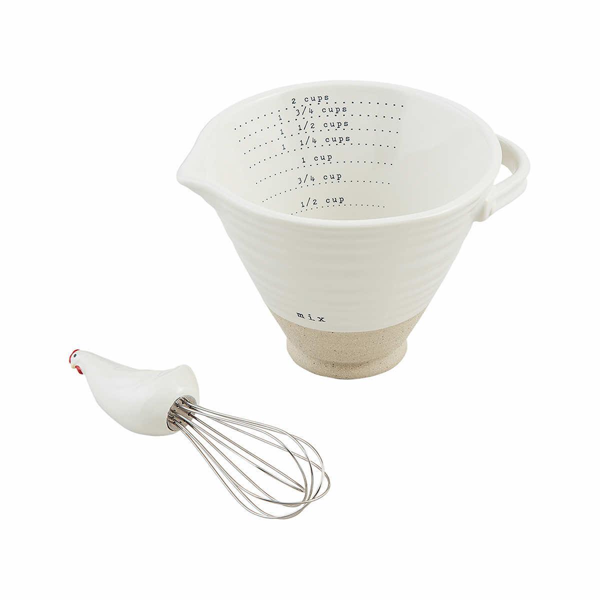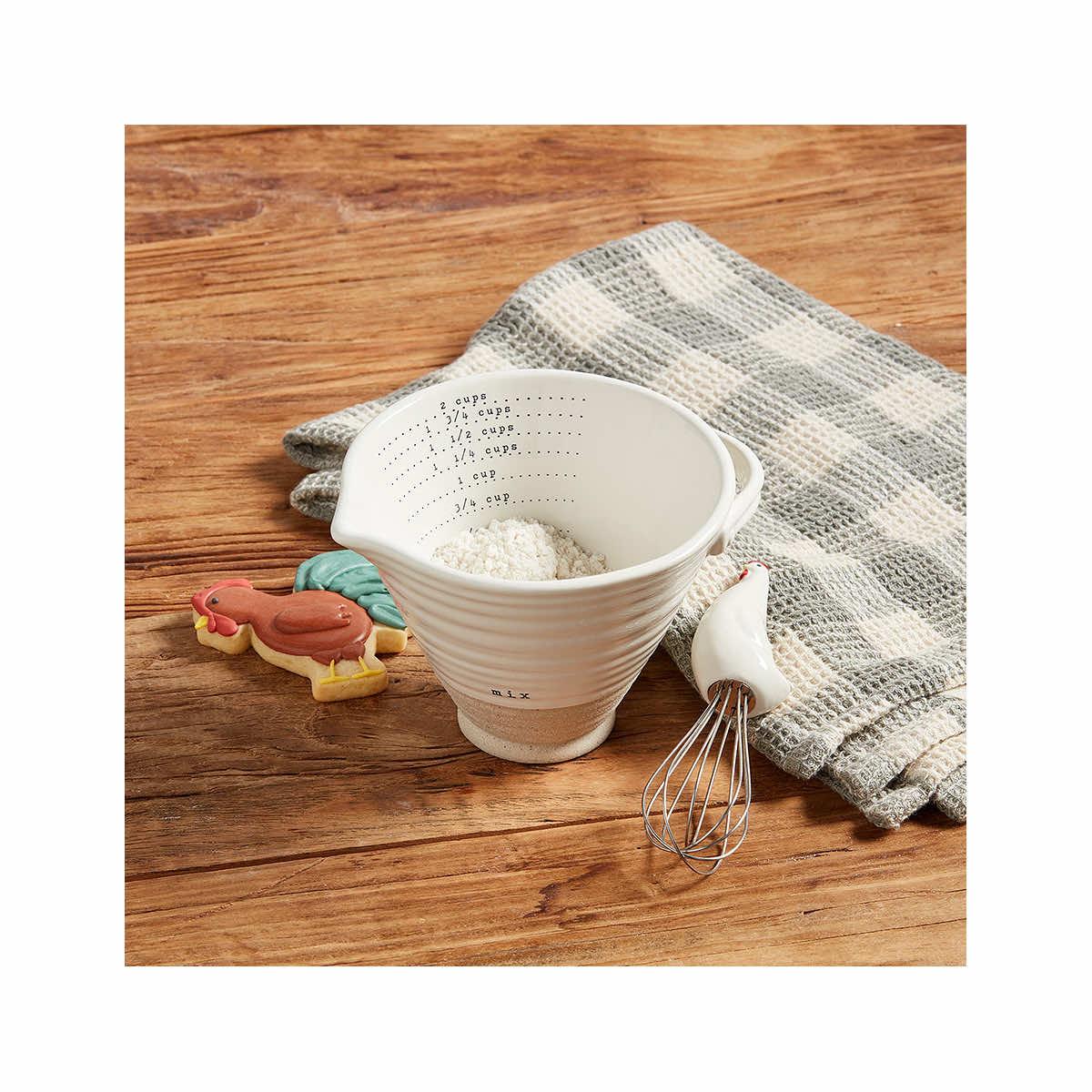 Your country kitchen isn't complete without the Farm Measuring Cup Set from Mud Pie! The rustic texture of the stoneware measuring cup will fit right in with your home decor, plus the set includes an adorable metal whisk with a handpainted ceramic chicken perched on top. High-quality and fun, this measuring cup set will charm you immediately!