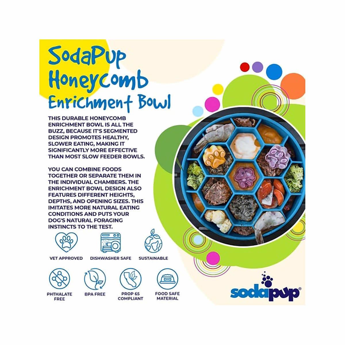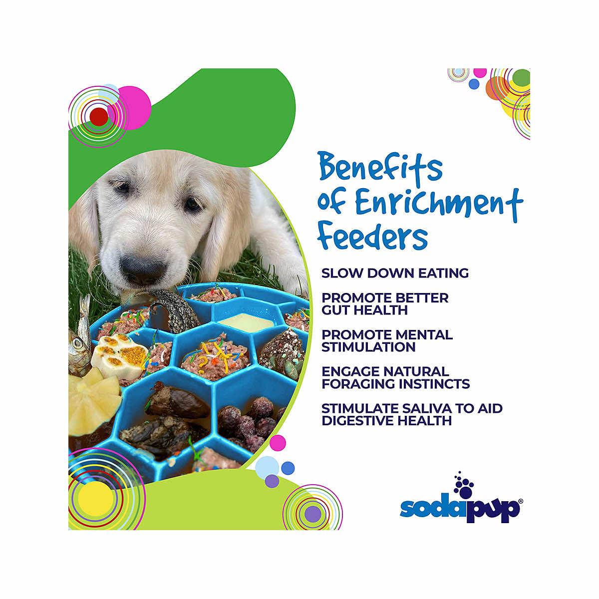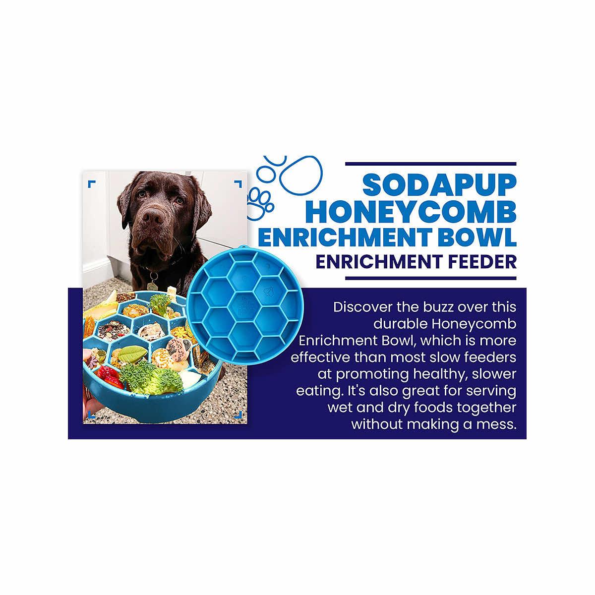 The durable and delightful Blue Honeycomb Enrichment Slow Feeder eBowl from SodaPup is all the buzz with a segmented design that promotes healthy, slower eating and improves digestion for the furry good boys and girls in your life. The individual chambers are designed to serve up wet and dry meals together or separately without making a mess. The different heights, depths, and opening sizes imitate more natural eating conditions and put your dog's natural foraging instincts to the test. Slower eating has the following benefits: calming and soothing for your dog, may help prevent bloat, improve digestion, better gut health, and small meals to last longer. The Honeycomb Enrichment Slow Feeder eBowl may help keep your furry companion entertained, reduce separation anxiety, and reduce boredom and unwanted behaviors associated with boredom.